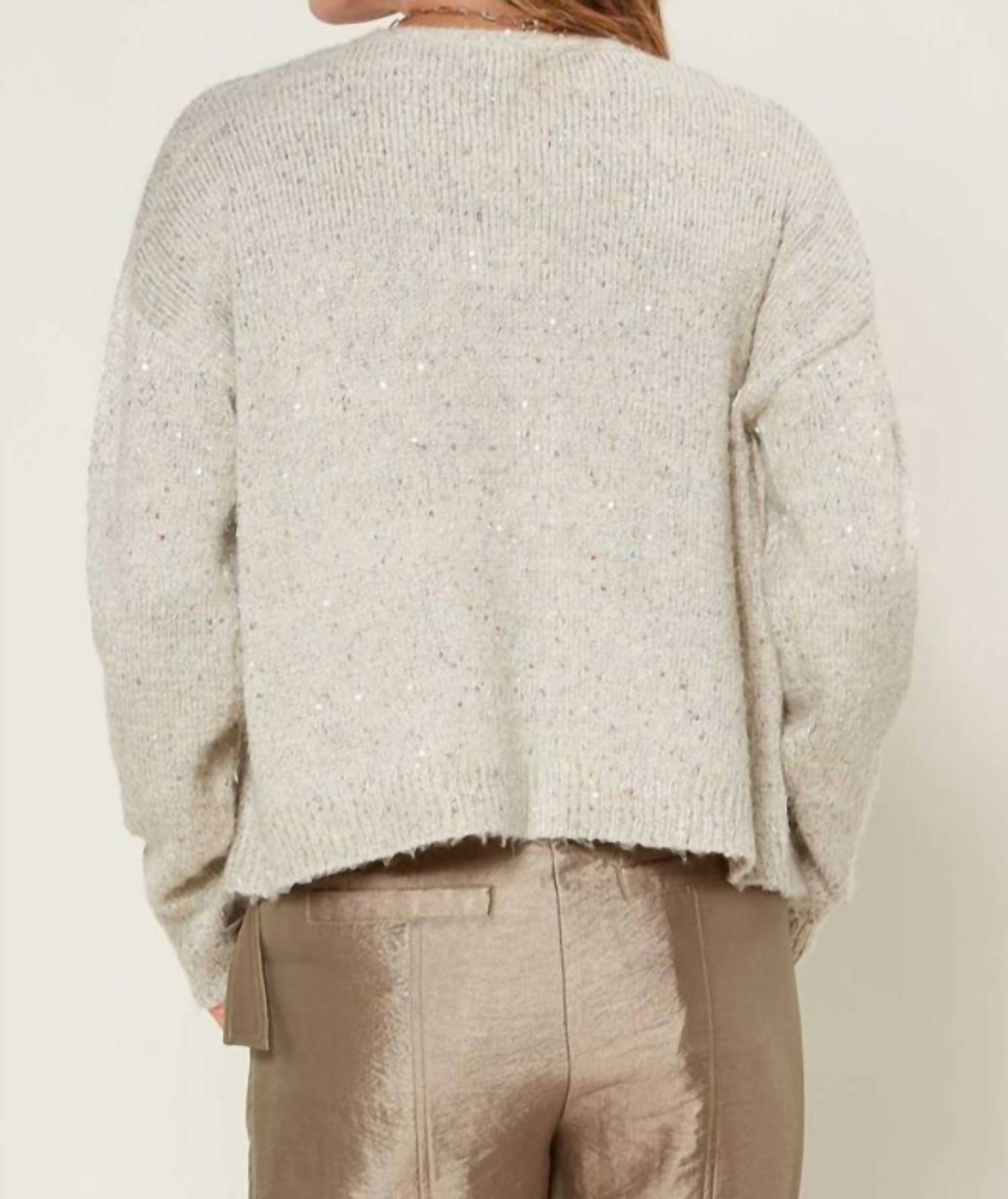 Throw this adorable cardigan over any cami or tank top. Elevate your wardrobe with the Soft Sequined Cardigan by Current Air, a chic beige piece designed for versatile elegance. Featuring long sleeves and a slouchy silhouette, this V-neck cardigan offers a subtle sparkle through its sequined knit. Closure is facilitated by a stylish button closure, making it perfect for transitioning from day to night. This minimalist design is ideal for dinner parties and more.