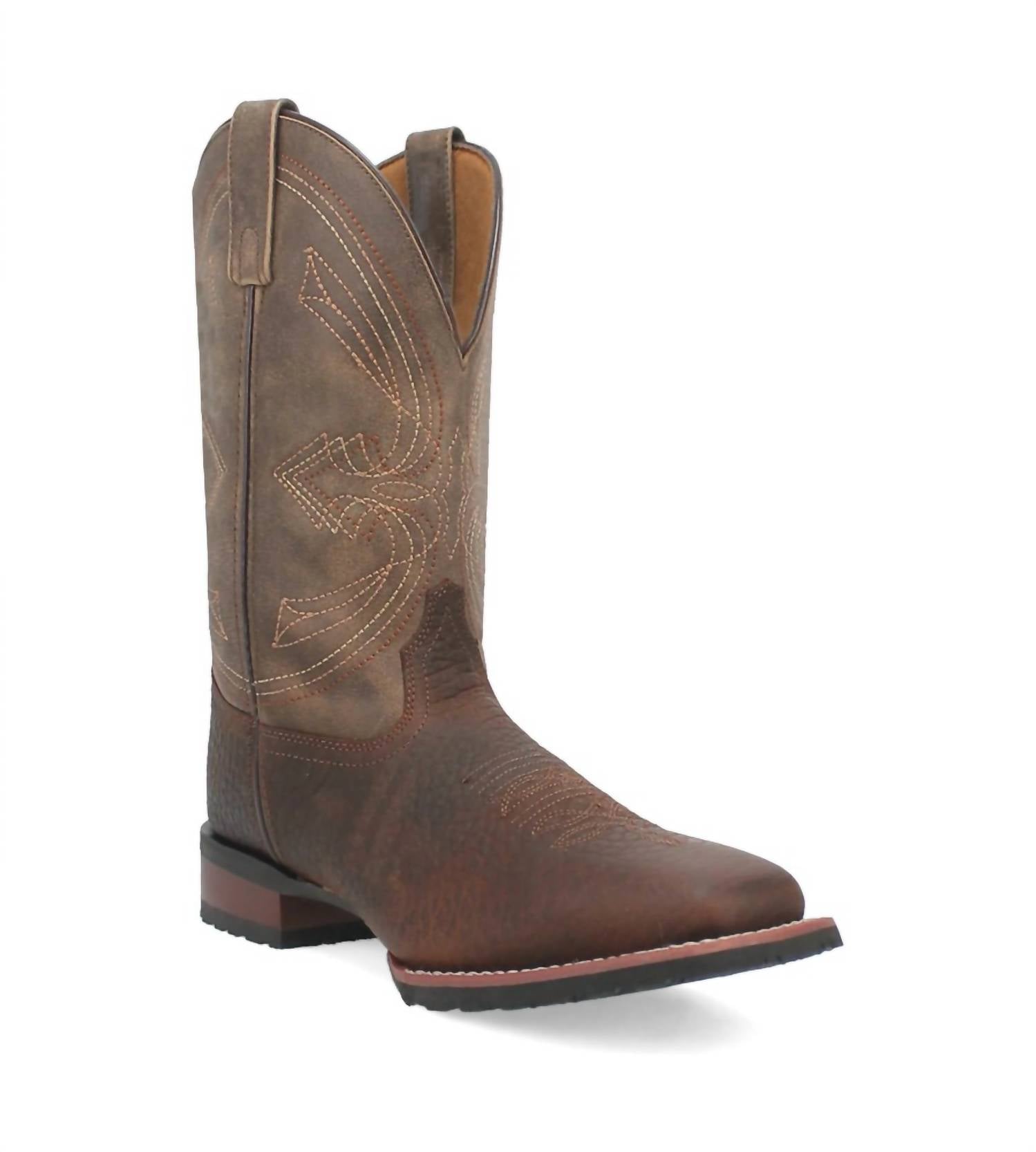 Introducing the Men's Elias Western Boot by DAN POST, a perfect blend of comfort and style in chocolate and tan. Crafted from premium leather, these boots feature a broad square toe and a stockman heel, ideal for navigating rugged terrains. A removable orthotic ensures personalized comfort, making them perfect for any fall occasion, including holiday parties. Embrace the Western trend with these versatile cowboy boots designed for adult men.