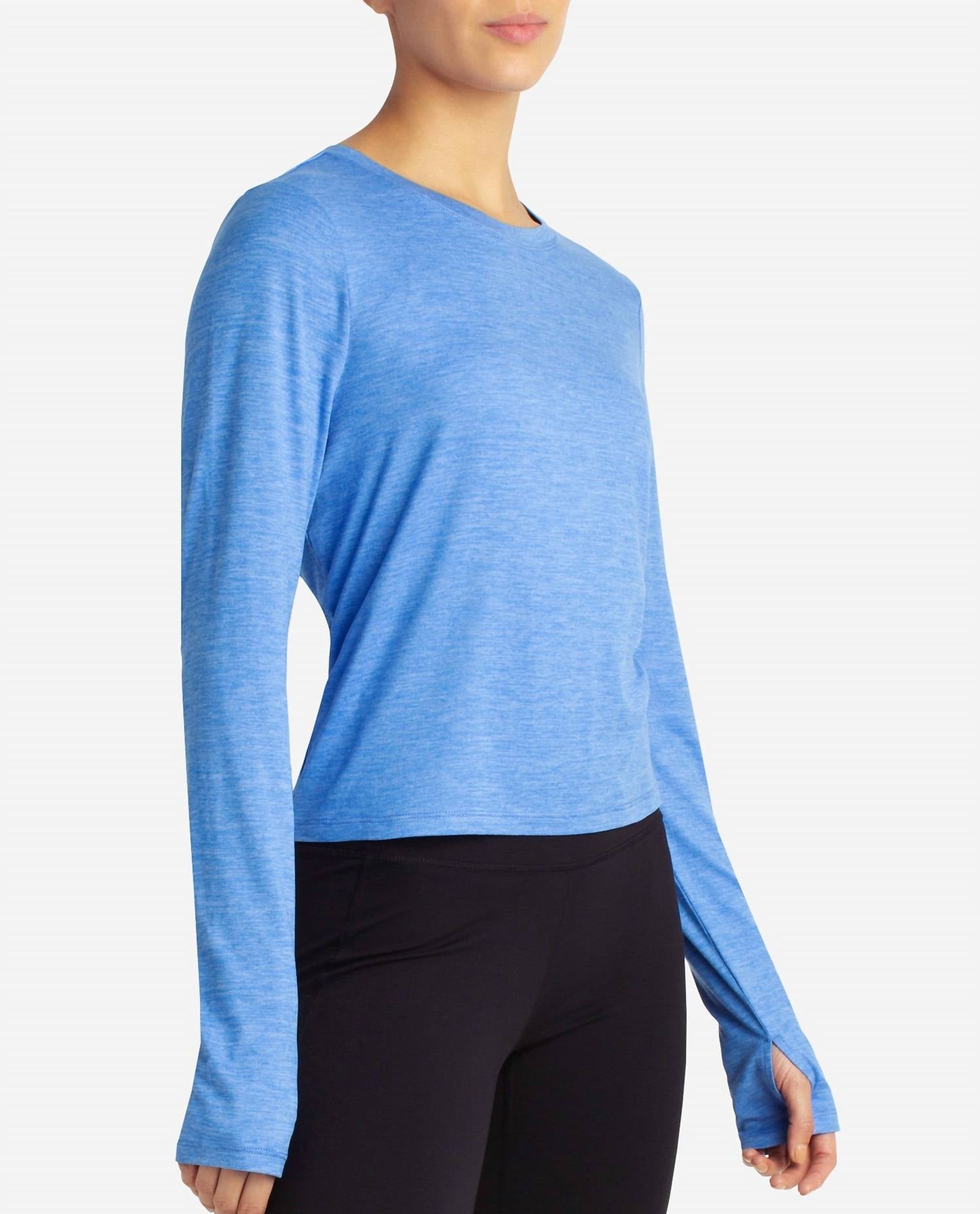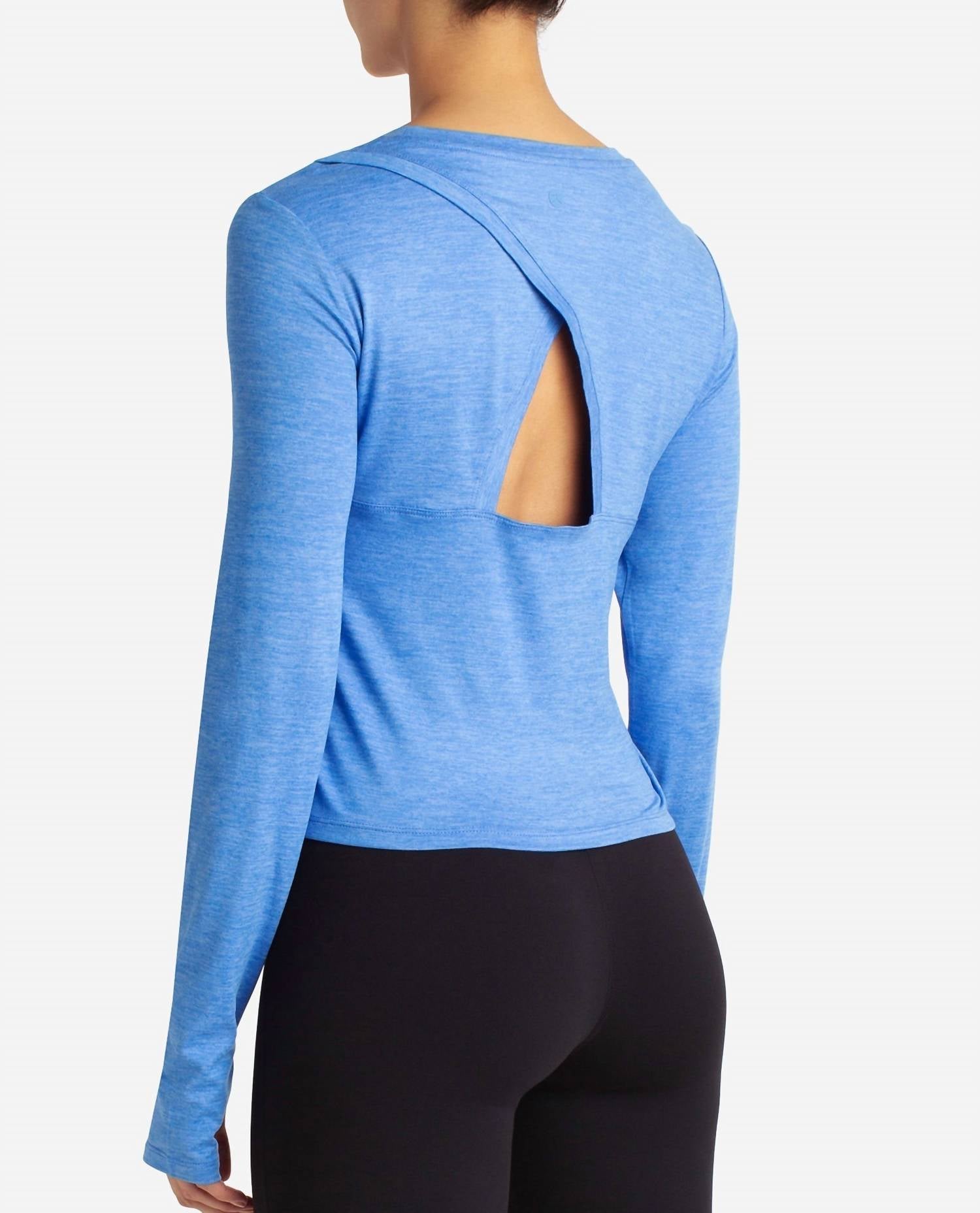 The perfect long sleeve tee that goes with just about anything. Elevate your travel wardrobe with the Danskin Cutout Cropped Long Sleeve Tee in Palace Blue Heather, a minimalist staple perfect for summer adventures. Designed with a sleek crewneck and thumbholes, this tee features a unique cutout back detail. Composition: 93% Polyester, 7% Spandex. Closure: Pull on. Care: Hand wash and line dry for lasting quality.