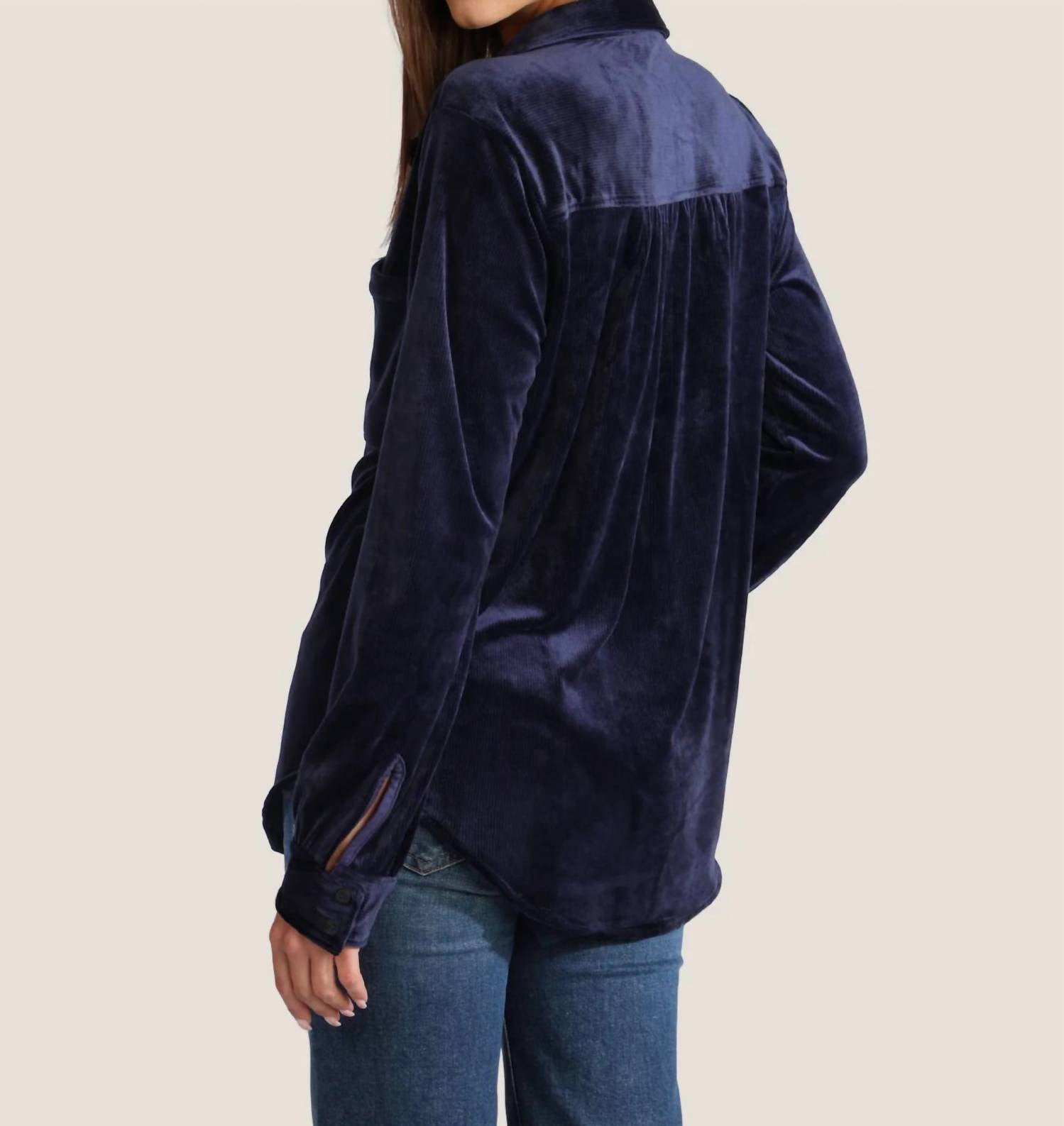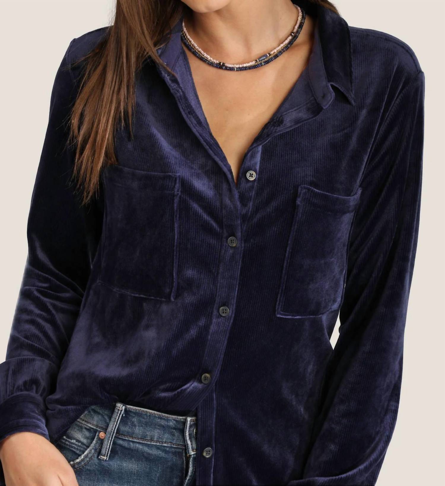 This button down shirt is comfortable yet polished. The Maeve button-up shirt crafted in soft, effortless and refined knit corduroy is a best-seller year after year. Relaxed fit, model is wearing size small. effortless & refined plush velvet, knit corduroy F6W89VKC-NVY Fabric information: 90% Polyester, 10% Spandex