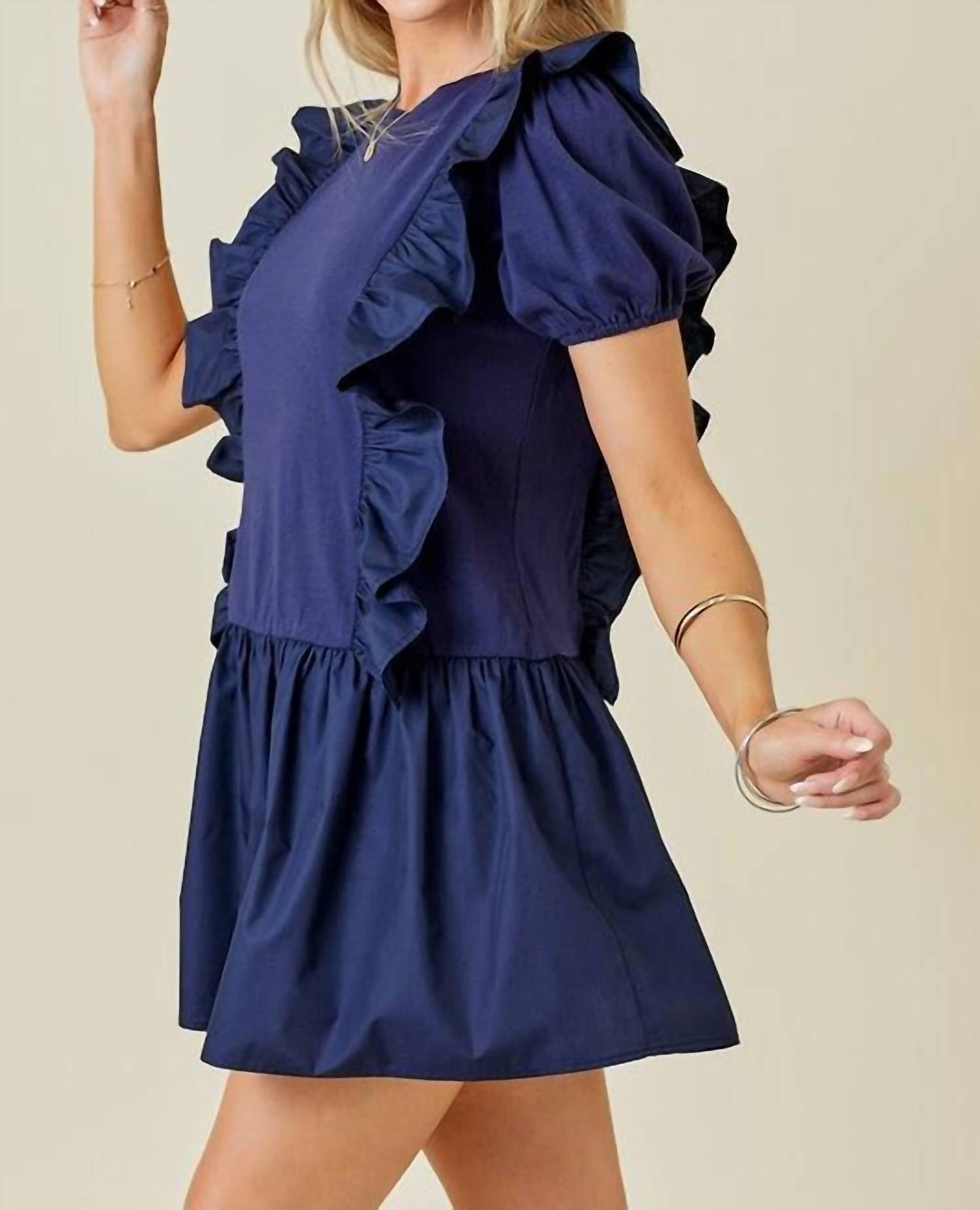 The perfect mini dress for those warmer months. Introducing the Drop Waist Mini Dress by Day + Moon, a short sleeve A-line silhouette that exudes minimalist allure in a solid navy hue. This versatile piece is crafted for both vacation and summer occasions, with an elegant crewneck design. Although it lacks pockets and a defined closure type, its effortless style is perfect for creating polished looks. Dress it up or down effortlessly with your existing accessories for a chic, modern ensemble.