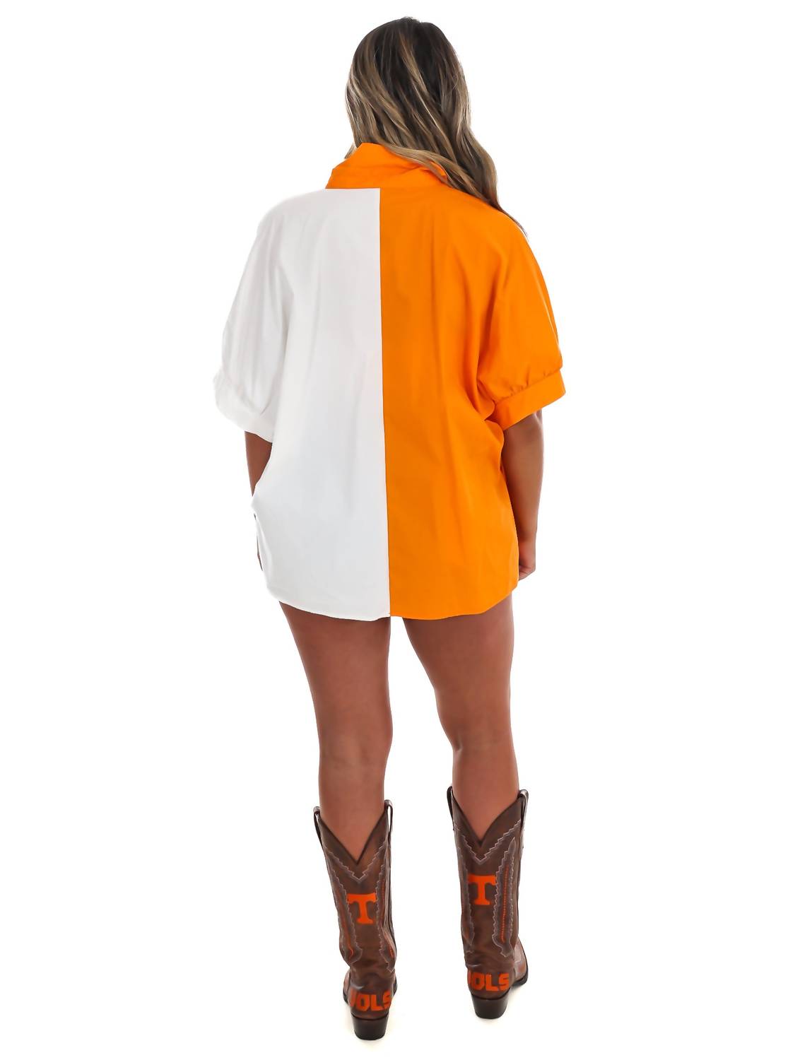 This button down shirt is comfortable yet polished. Elevate your game day style with the Two Tone Button Down Top by day + moon, designed in a striking Tangerine/White colorway. This women's short sleeve shirt features a contrasting collar and a minimalist solid pattern, making it perfect for spring vacations or Thanksgiving gatherings. Closure: Button closure. Care: Hand wash and line dry for best results.