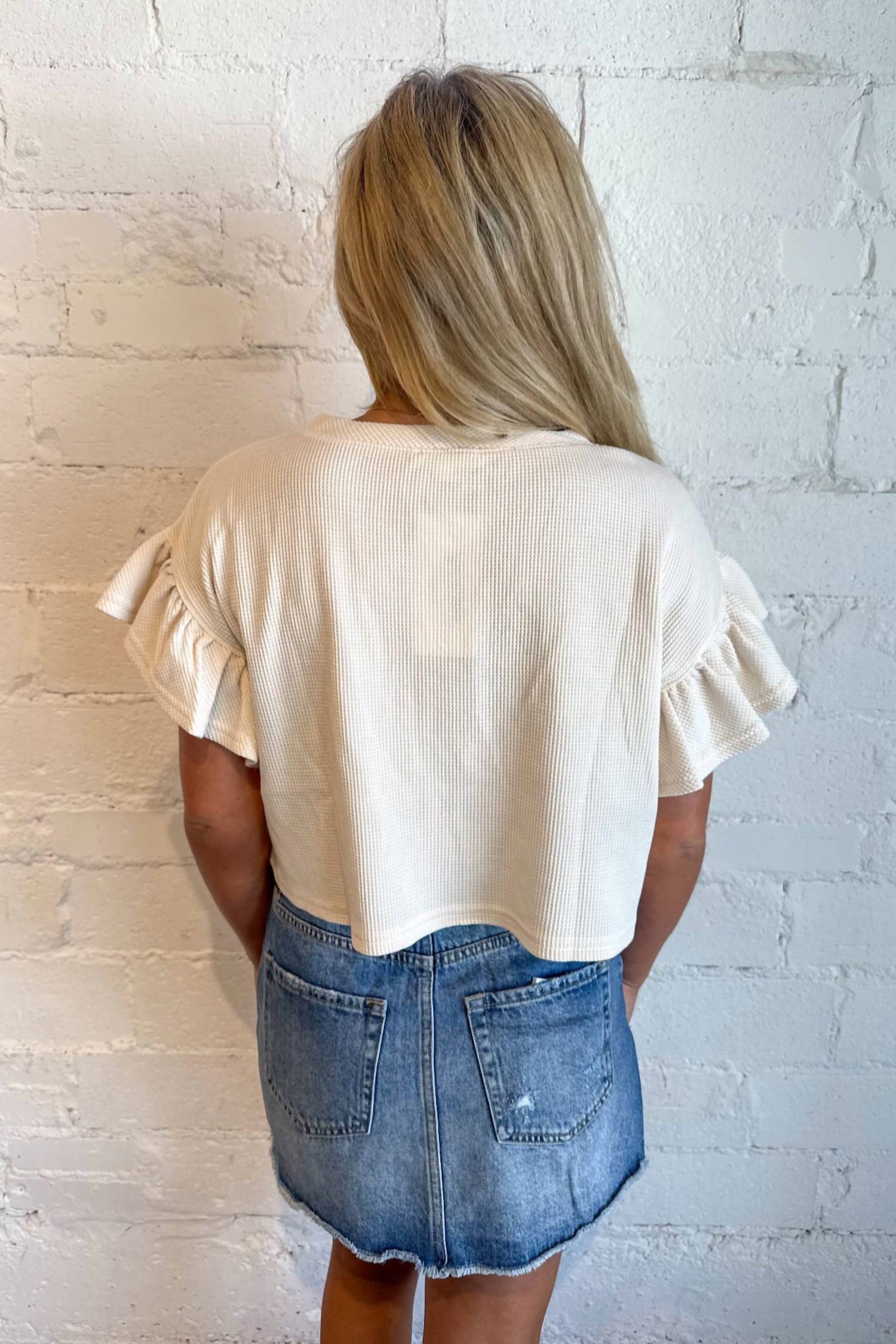 Pair this crop top with your favorite high-waisted jeans or maxi skirt. Discover the Waffle Knit Ruffle Top by Day + Moon, a charming blend of casual comfort and feminine allure in a flattering cream hue. With its short sleeves and soft crewneck, this textured cotton blend top ensures a cozy fit all day. Composition: 65% Polyester, 35% Cotton. Closure: Pull on. Care: Hand wash cold, do not tumble dry, lay flat to dry. Model is wearing a size small (5'6" height, 33" bust, 25" waist, 34" hip).