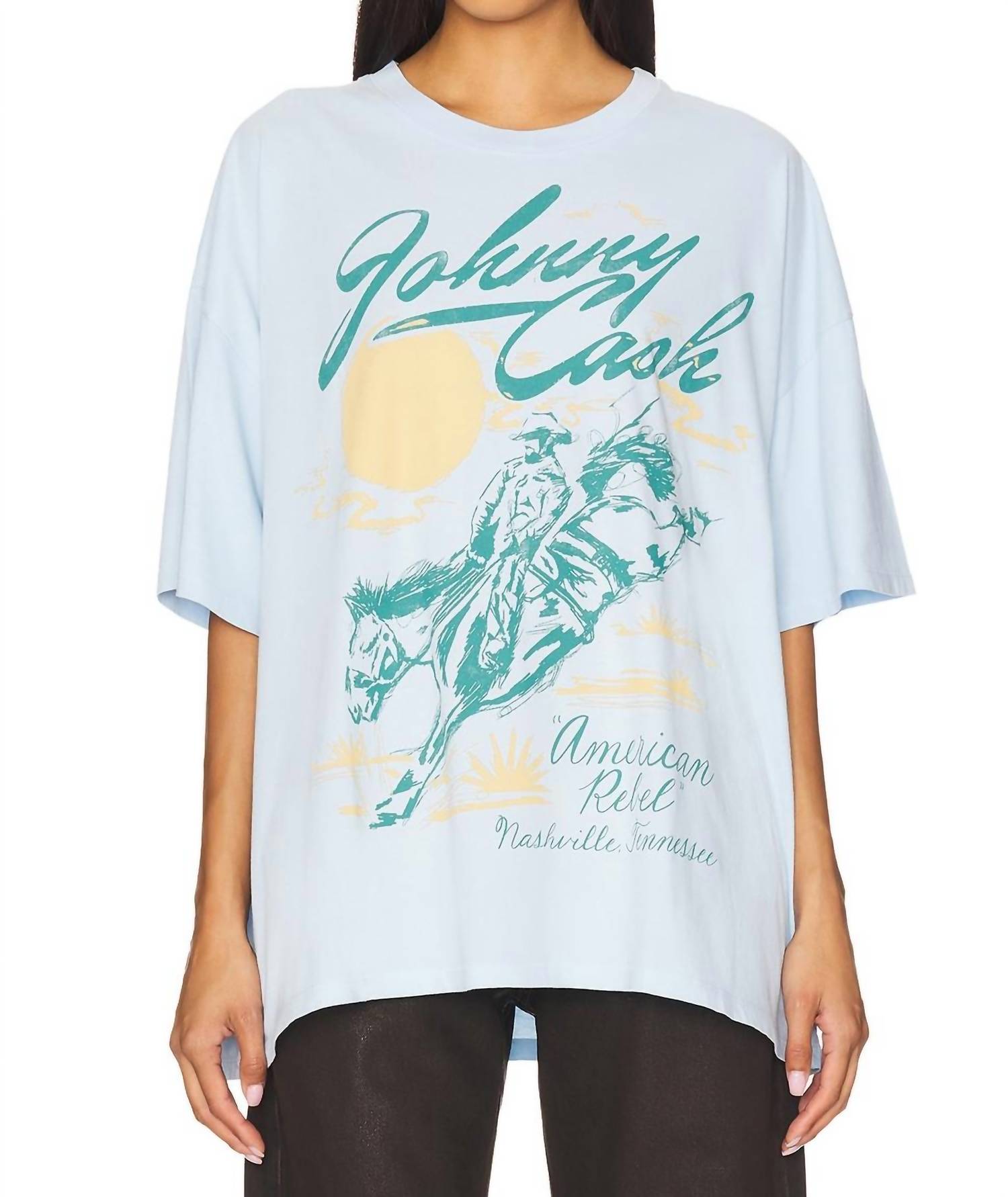 Look no further, you just found your perfect tee! Celebrate your love for music with the DAYDREAMER Johnny Cash American Rebel Tee in Airey Blue. This women's tee features short sleeves and is made from 100% cotton, offering a medium-weight jersey fabric for comfort and style. Made in the USA, this shirt has a striking front graphic print that showcases iconic streetwear flair. With a convenient pull-on closure, care is simple with a cold water machine wash, perfect for spring travel or Fourth of July outings. Designed to fit all sizes.