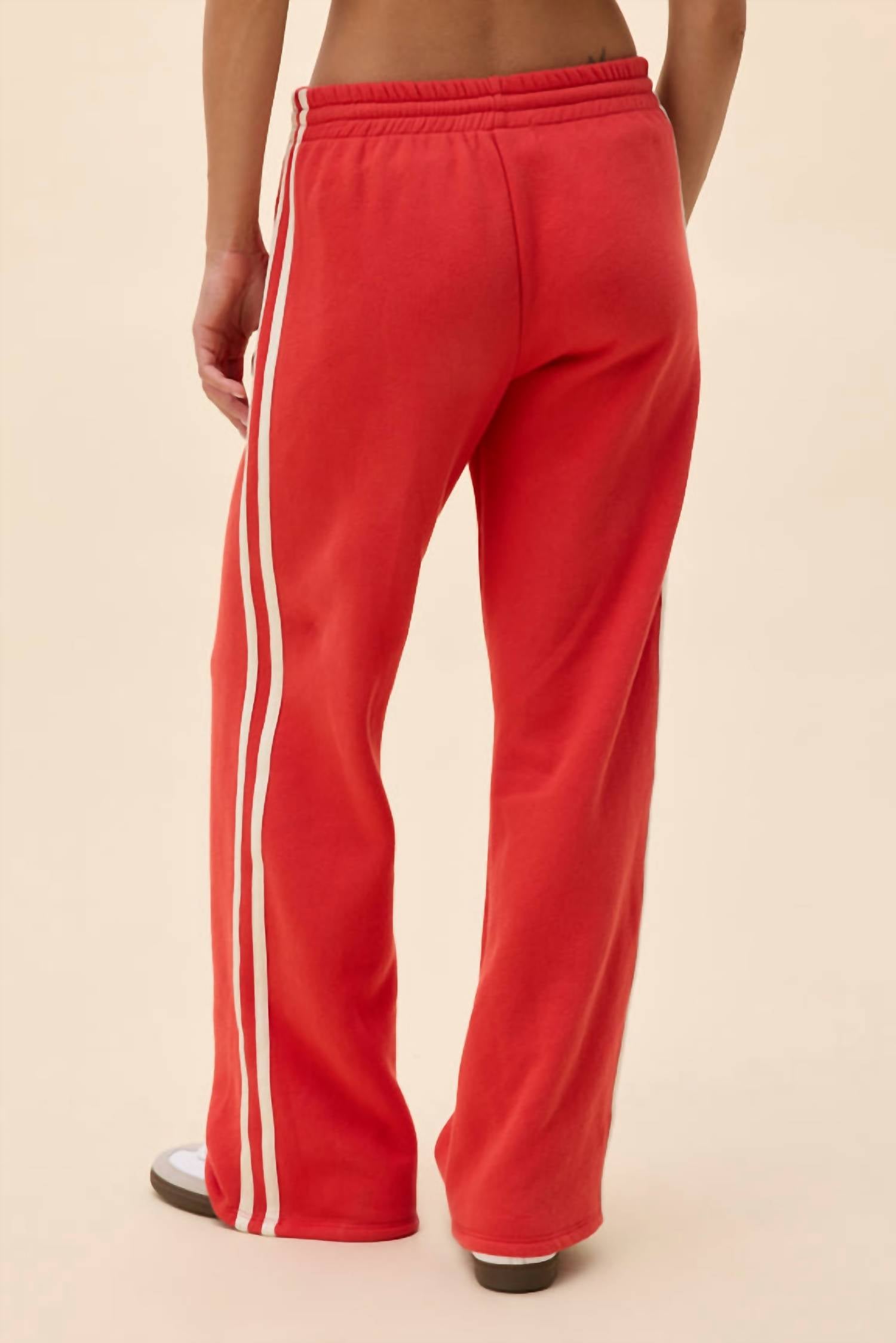 The perfect pant for running around town and looking cool while doing it. Meet the Women's Solid Track Pant by DAYDREAMER, crafted in a vibrant Vintage Red hue for a bold statement in your activewear collection. Featuring a high rise with a wide, straight leg fit, these pants are made from a midweight fleece perfect for year-round wear. The design is enhanced with an elastic waistband and contrasting drawcord, complimented by stripe details on the sides for added flair. Closure type: Pull on. Ideal for travel and spring styling.