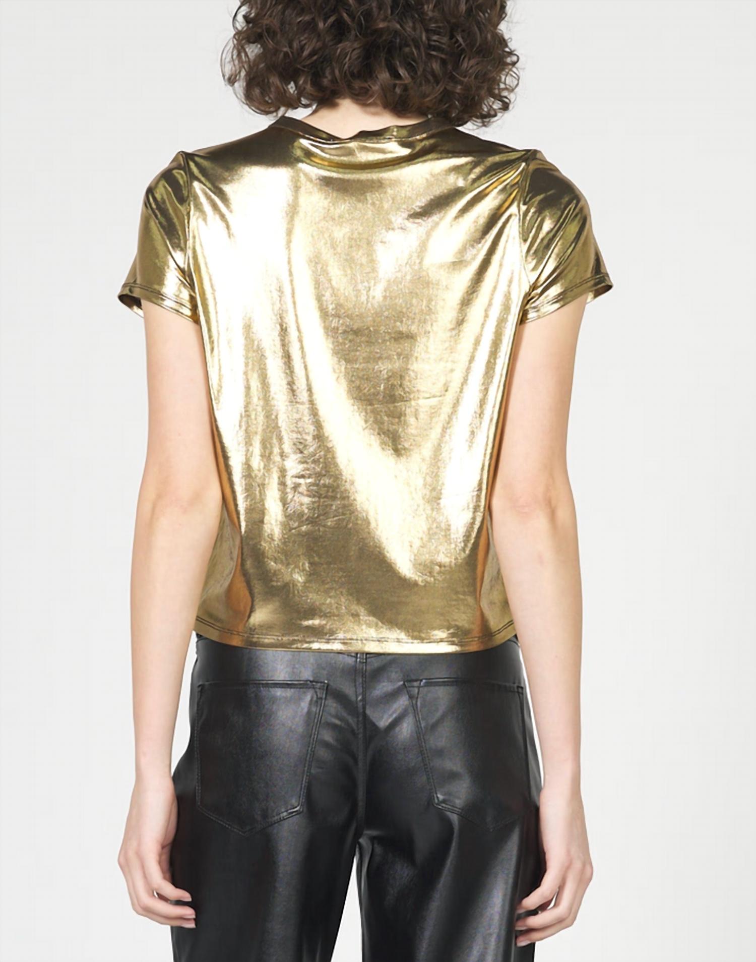 Look no further, you just found your perfect tee! Elevate your holiday party look with the Unity Top by Dear John Denim, featuring a dazzling black and gold design. This short sleeve tee is crafted from a blend of 95% polyester and 5% spandex, offering a sleek and comfortable fit. With its crewneck style and easy pull-on closure, it's a chic option for summer workwear or 4th of July celebrations. To keep its lustrous finish, hand wash and line dry the garment.