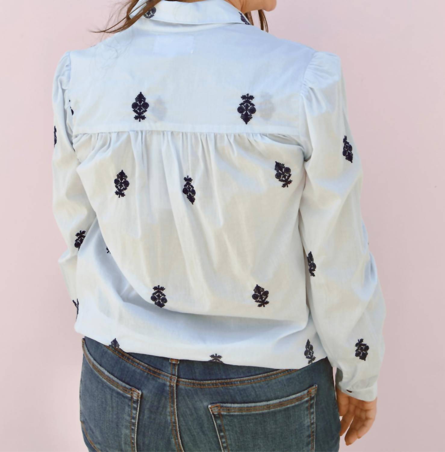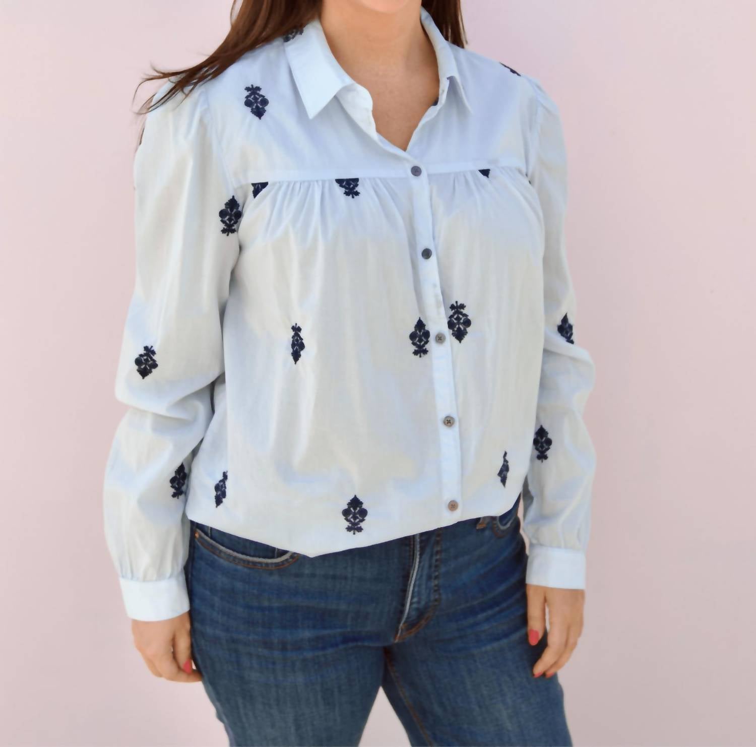 This button down shirt is comfortable yet polished. Introducing the Nasrin Button Down Shirt by DEAR JOHN DENIM, a chic addition to your workwear collection. This milky blue shirt is crafted from 100% cotton, ensuring comfort and breathability. It features long sleeves and a classic collar, complete with an embroidery pattern for added elegance. Closure: Button closure. Care: Machine wash. Perfect for spring engagements and Easter celebrations.