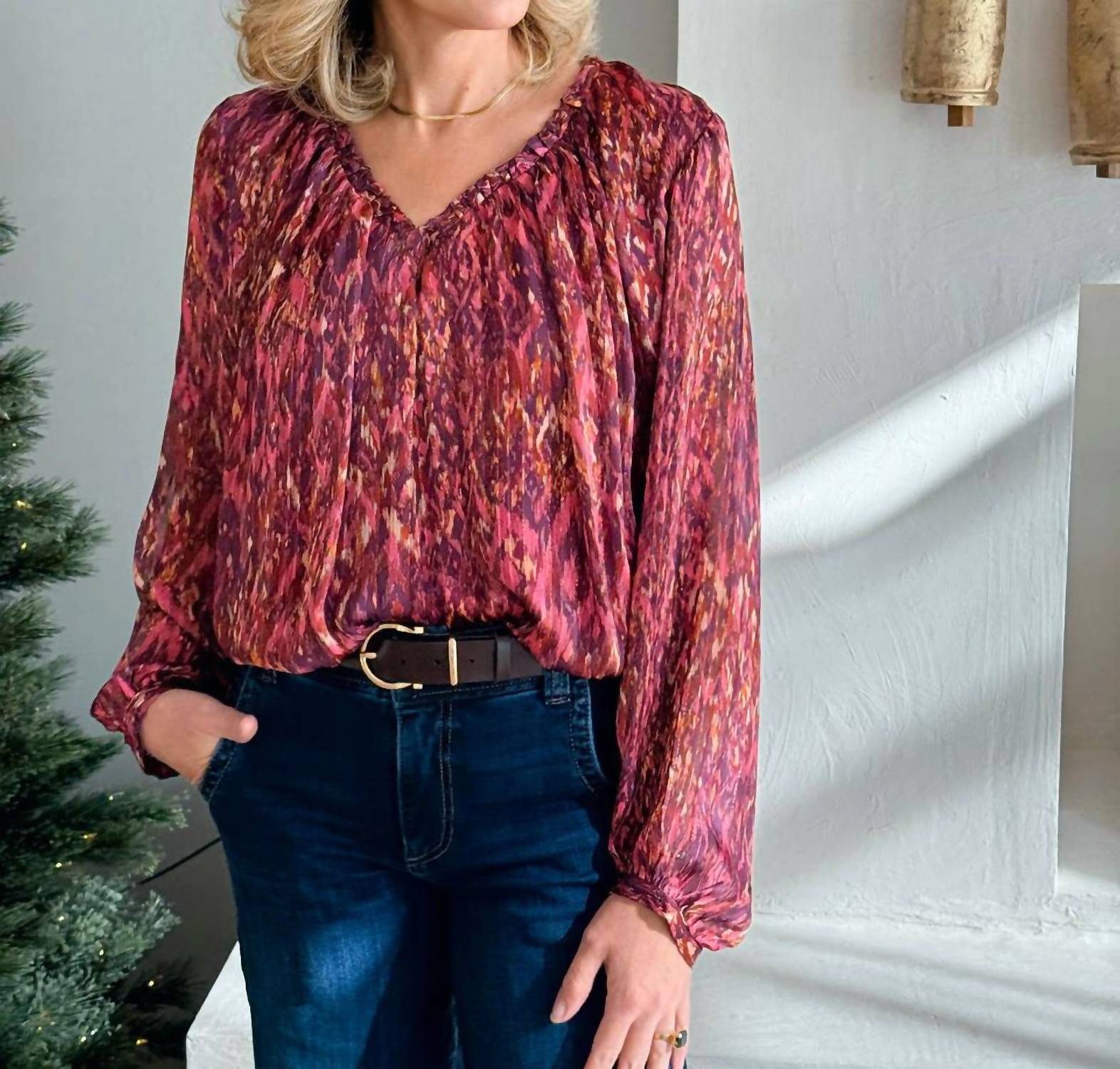 A versatile blouse that works from desk to dinner! The Piaf V-neck Blouse by DEAR JOHN DENIM is an elegant choice for a variety of occasions. Crafted from 100% polyester, this patterned boho chic blouse features long balloon sleeves and a flattering V-neckline. The pull-on design is both sophisticated and functional, enhancing its appeal in the rich Pomegranate Flame color. Simply machine wash to maintain its vibrant look.