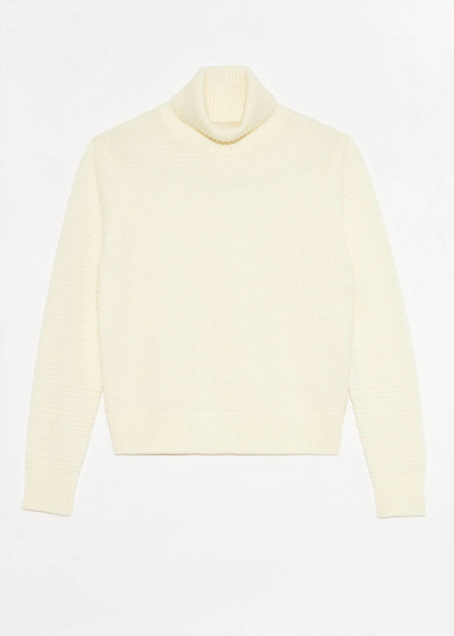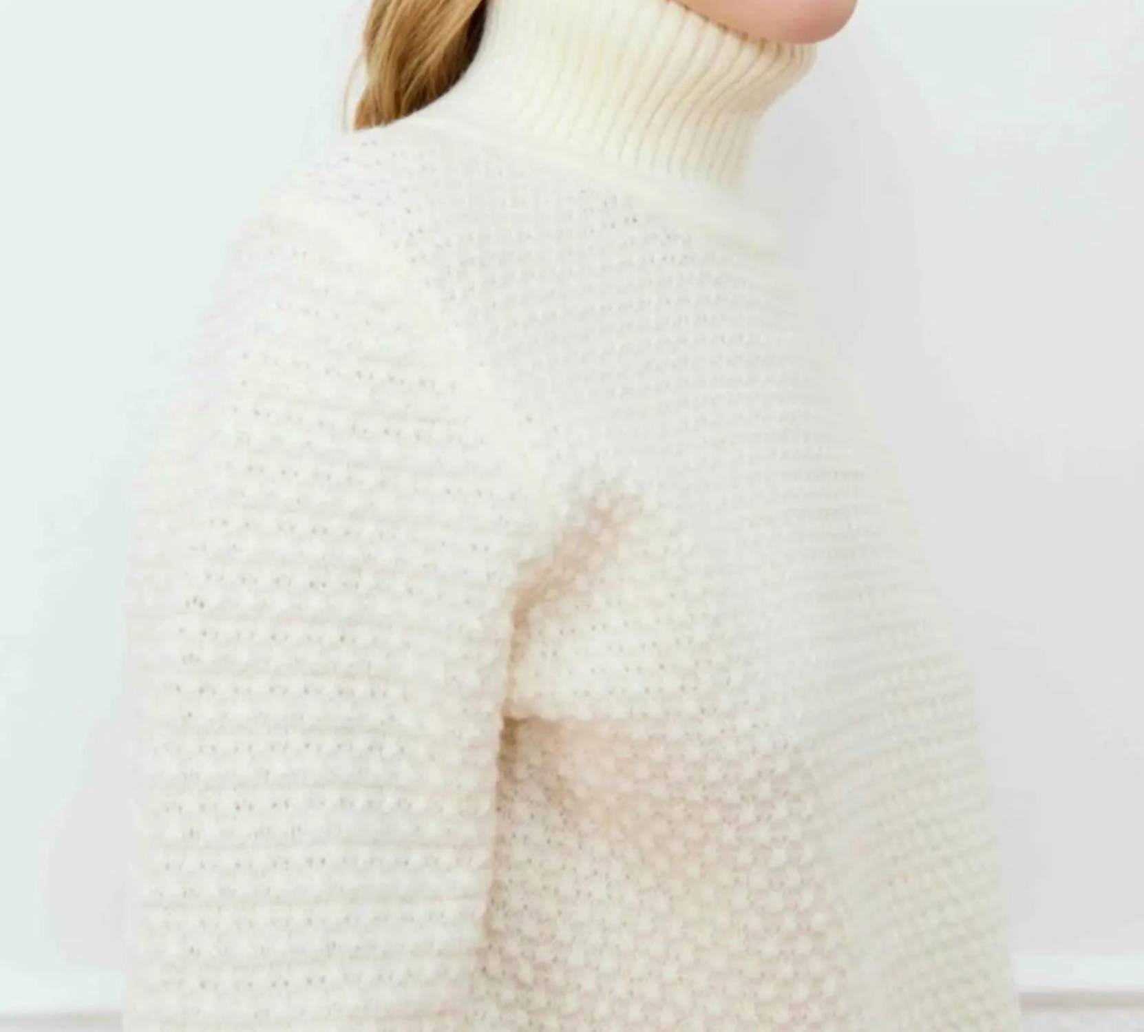 Fit to perfection and effortlessly chic. Introducing the Carlina Sweater by DELUC, an essential for the minimalist wardrobe in ecru, perfect for winter travel. This cozy piece features long sleeves and a turtleneck design, crafted from an acrylic blend with a textured knit. Closure: Pull on. Care: Hand wash. Model is 5'9" wearing a size S.