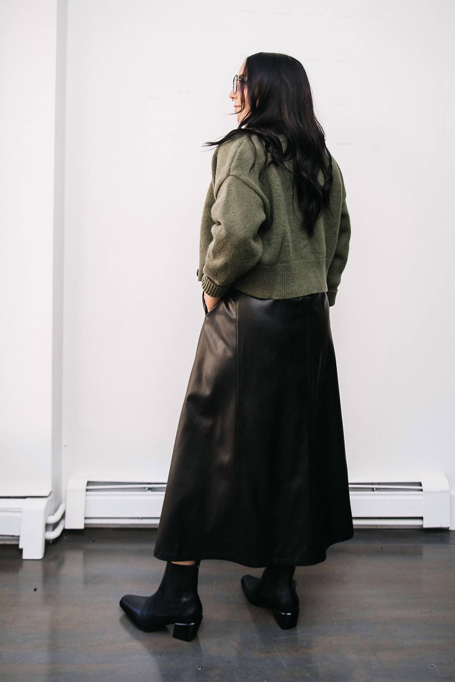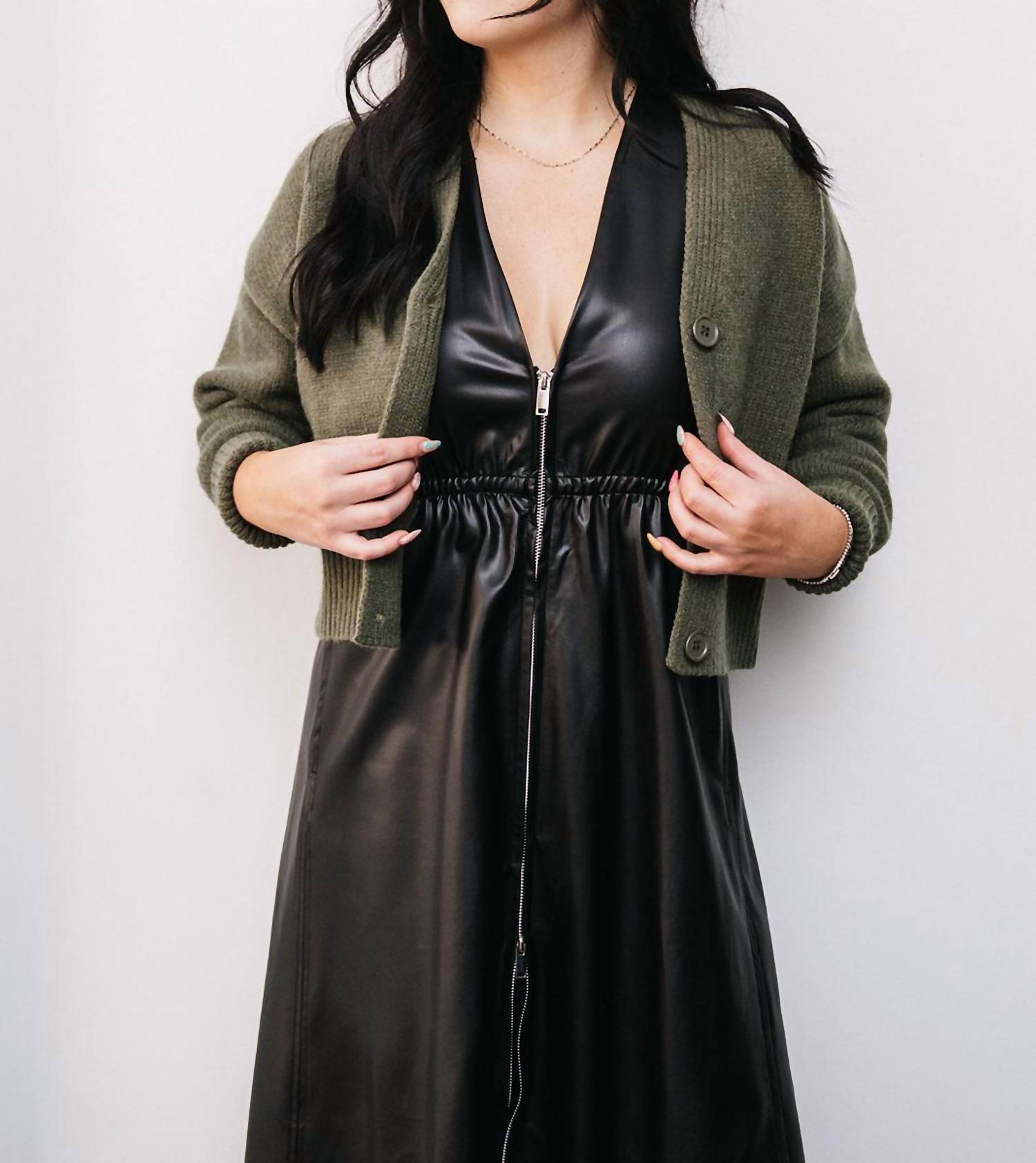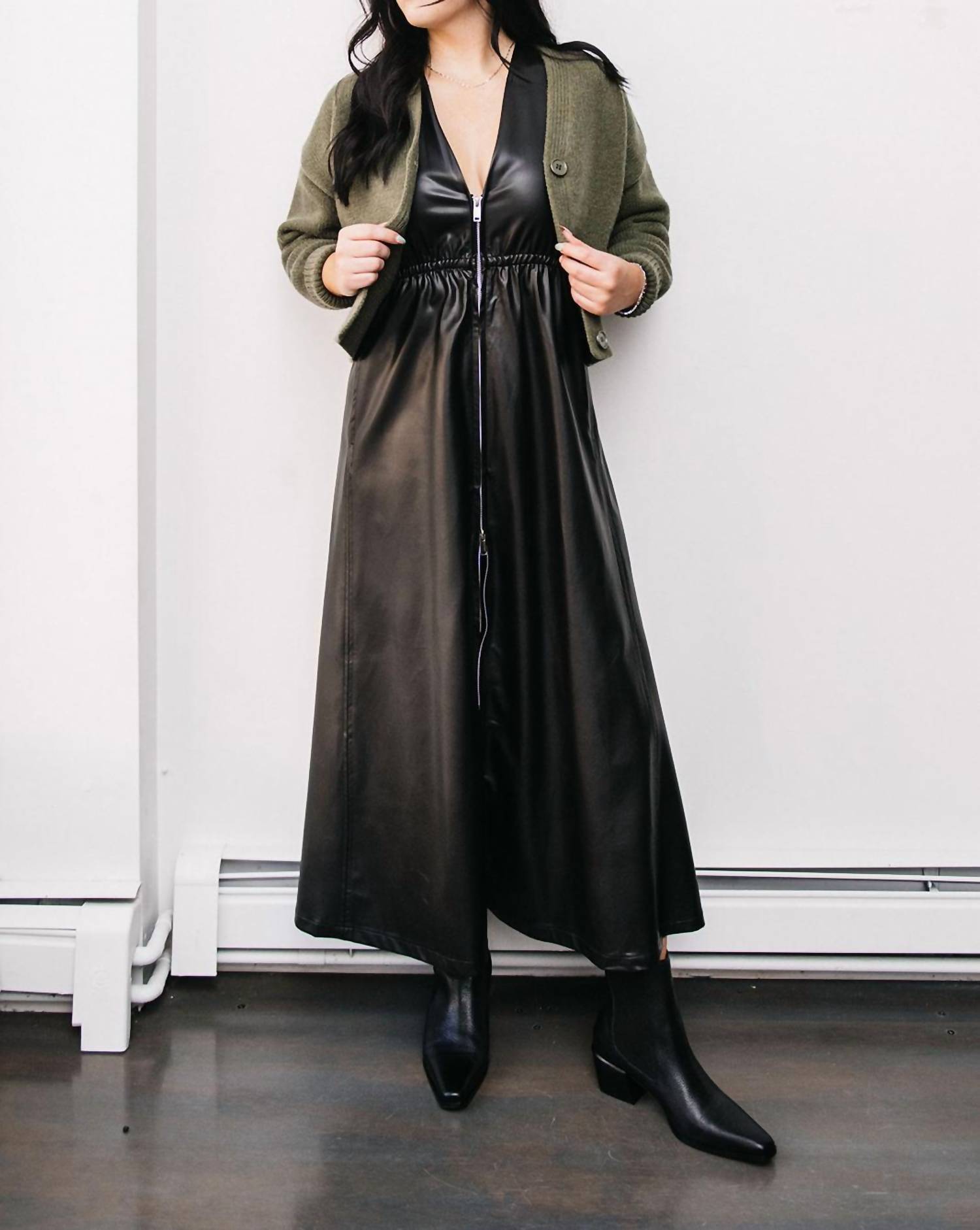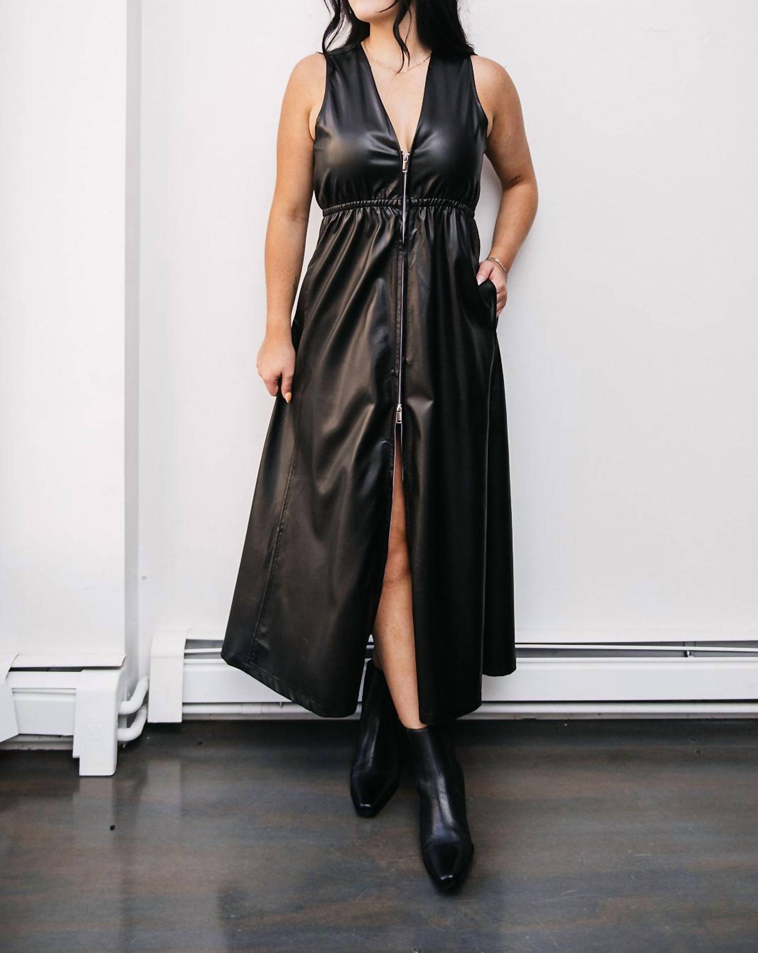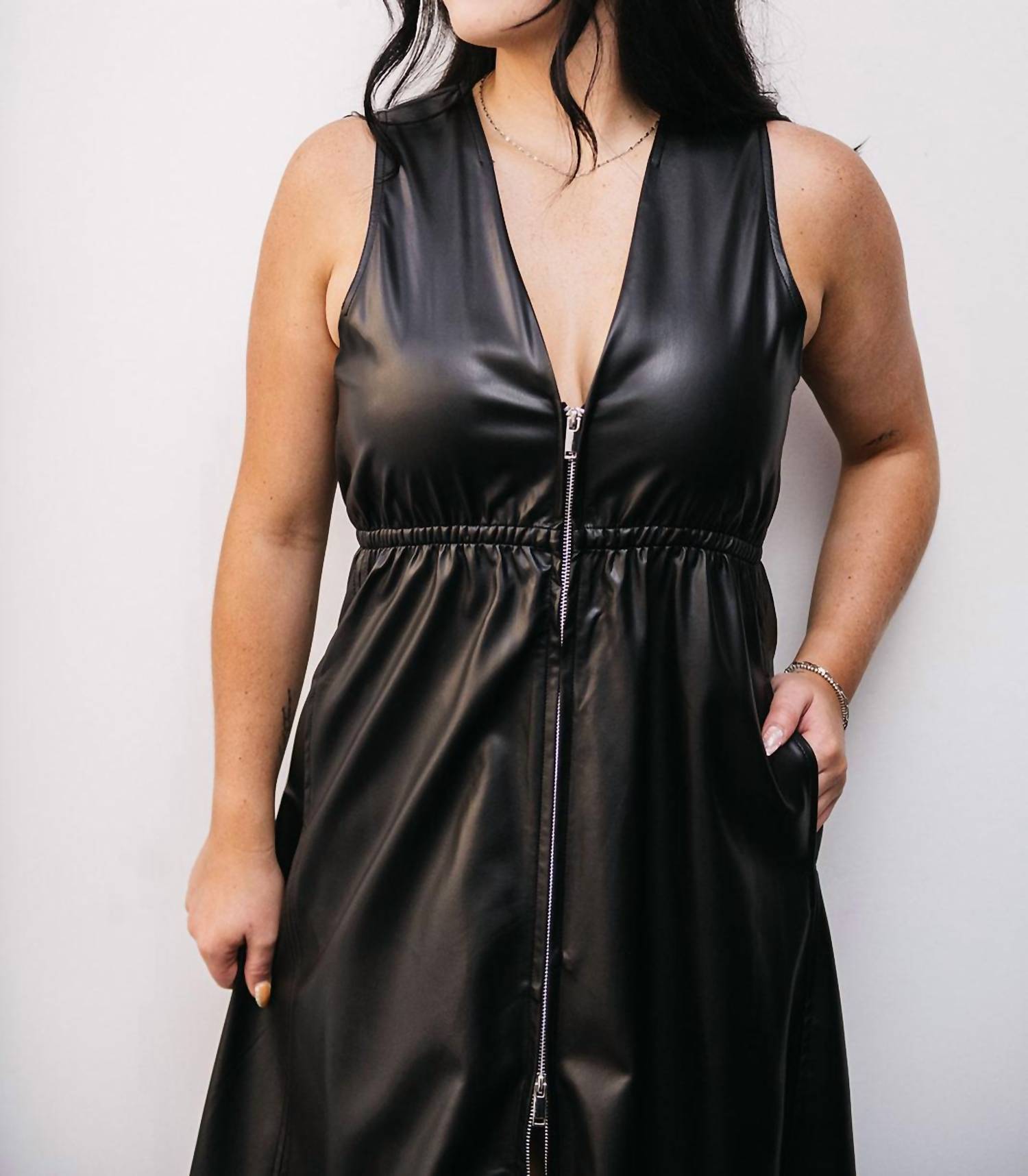 A midi dress so versatile, your options for wearing it are endless. Experience the edgy sophistication of the Faux Leather Midi Dress by DELUC, a striking addition to your wardrobe. This sleeveless, solid black dress features a V-neckline and an adjustable two-way zip closure for a customizable fit. Crafted from faux leather, its sleek slip silhouette includes a flattering elastic waist and integrated pockets for practicality. Perfect as a minimalist statement piece, it transitions seamlessly from day to night, making it ideal for a dinner party or any evening occasion.