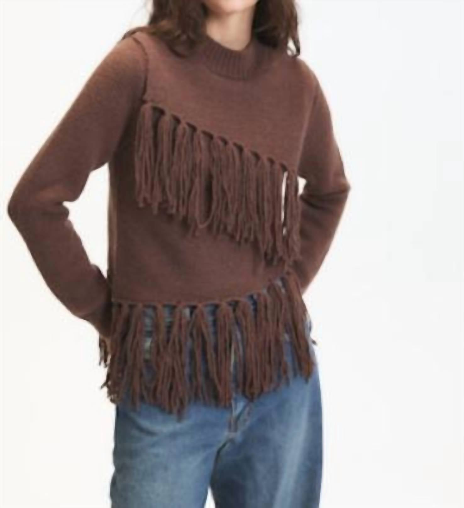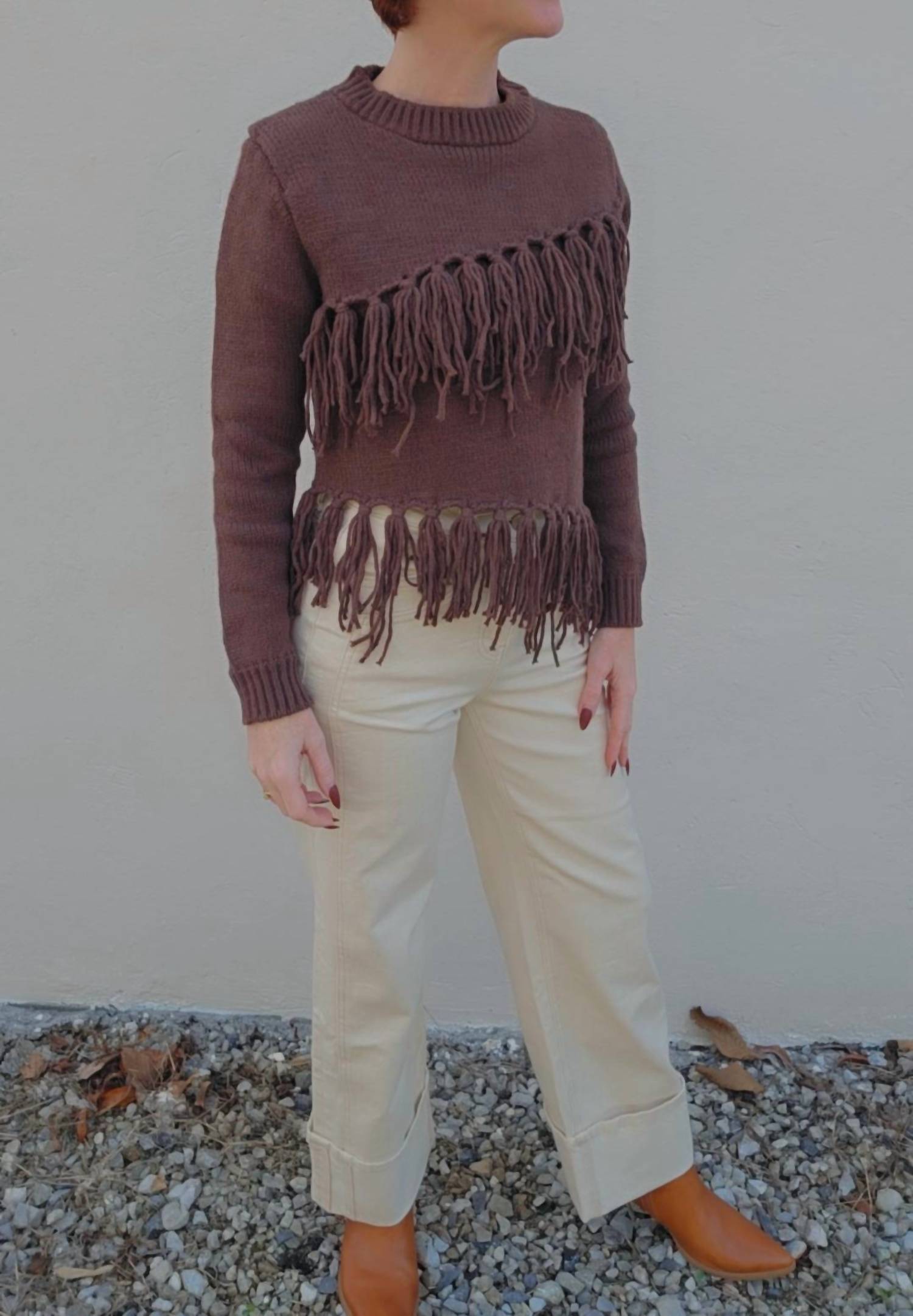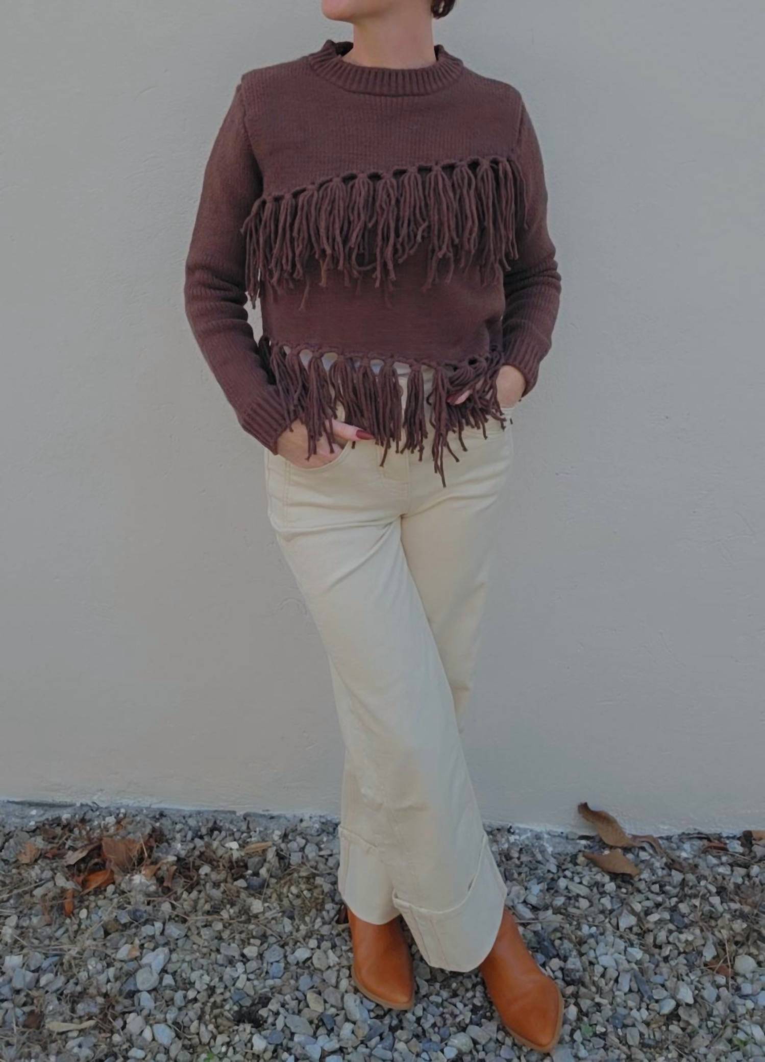 Experience the perfect blend of comfort and style with this trendy crew neck sweater, designed to effortlessly elevate your wardrobe. Pair it with your favorite denim and loafers for the perfect look. Wrap yourself in the cozy embrace of the DELUC Fringe Crew Neck Sweater, the ideal fall companion in rich chocolate brown. Crafted from textured knit, it features long sleeves and a classic crew neckline, offering a clean, polished silhouette. This sweater is designed with a pull-on closure for ease, highlighted by its fringe detailing at the front and hem, adding movement and a touch of boho chic. Care for it with a hand wash and lay flat to dry to maintain its soft, mid-weight feel.