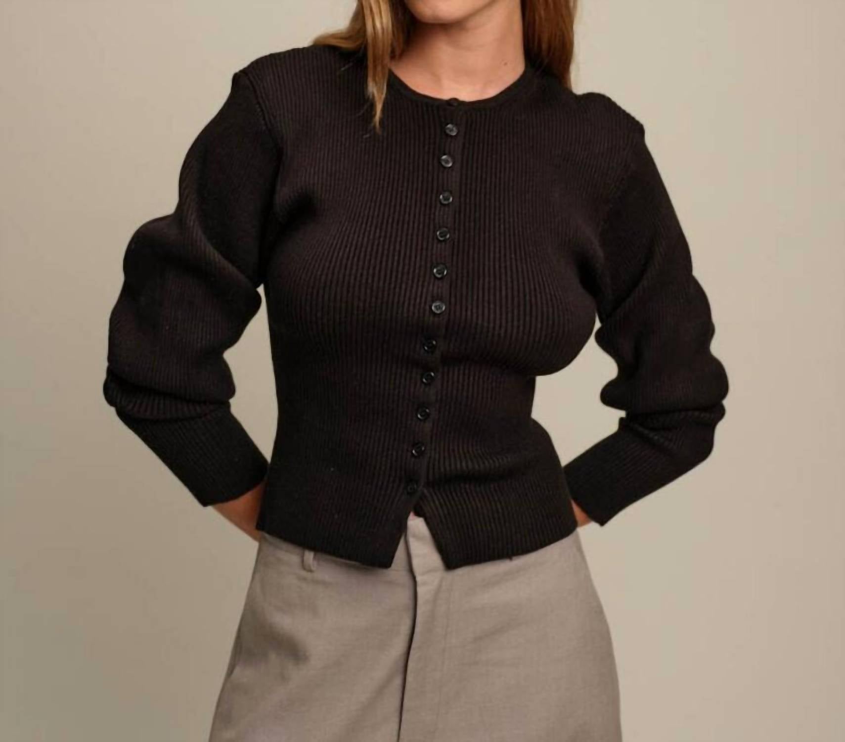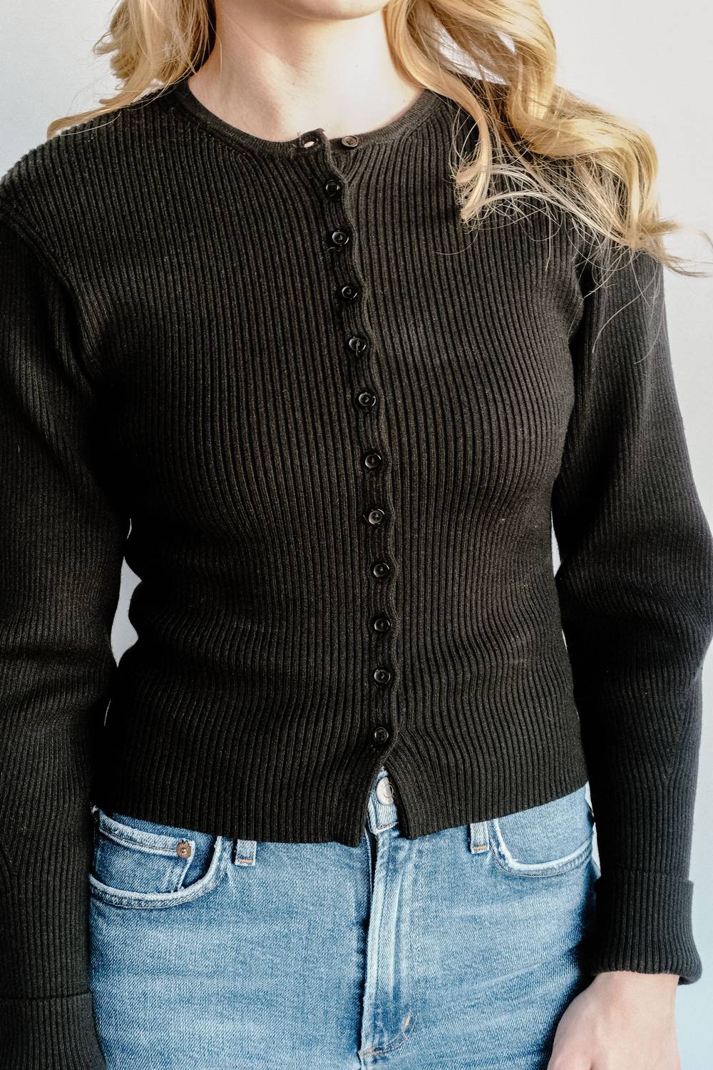 Throw this adorable cardigan over any cami or tank top. The Jack Lightweight Cardigan by DELUC combines comfort and style for everyday wear in a versatile black shade. Featuring long sleeves and a classic crewneck, this cardigan is crafted from a soft, lightweight knit with a textured pattern, perfect for layering. Its polished silhouette is enhanced by ribbed cuffs and a button closure, complementing casual and smart-casual outfits. Ideal for the Fall season, this monochrome piece is a sophisticated choice for Thanksgiving gatherings and engagements.