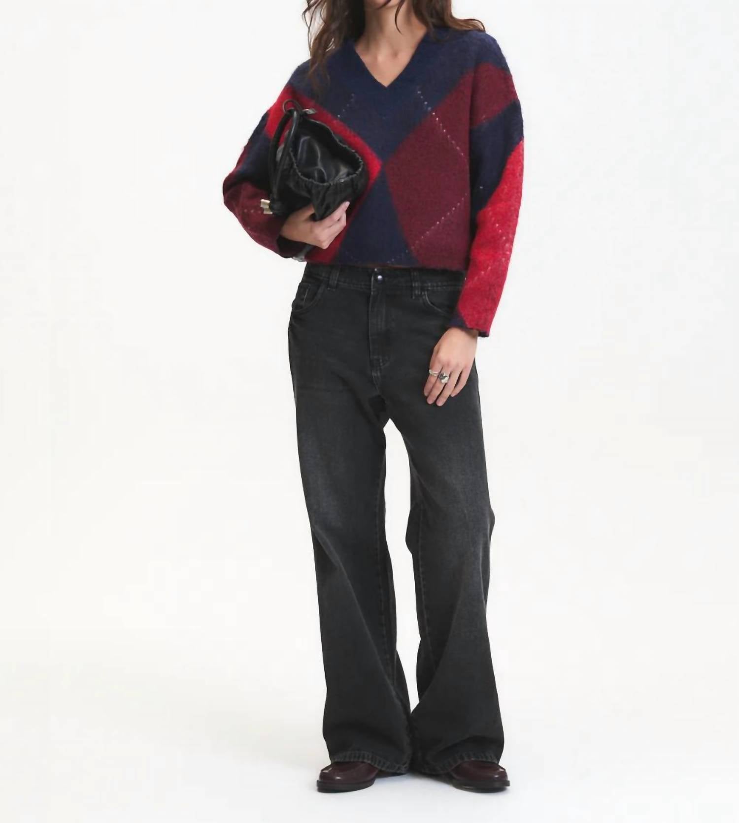 A timeless v-neck sweater that works season after season. The Micah Sweater brings bold style and comfort together in one cozy package. This eye-catching argyle design features a striking navy and red colorway that pairs with everything in your closet. Crafted from a thoughtful blend of recycled polyester, nylon, acrylic, wool, and spandex, it's built to move with you while keeping its shape. Perfect for layering over your favorite tee or wearing solo when the temperature drops. A playful essential that feels as good as it looks.