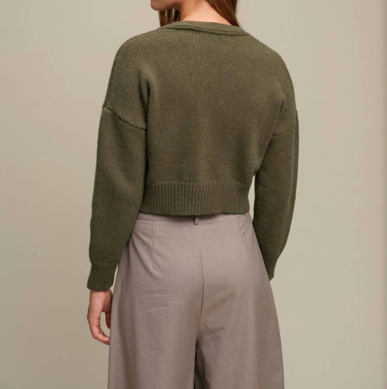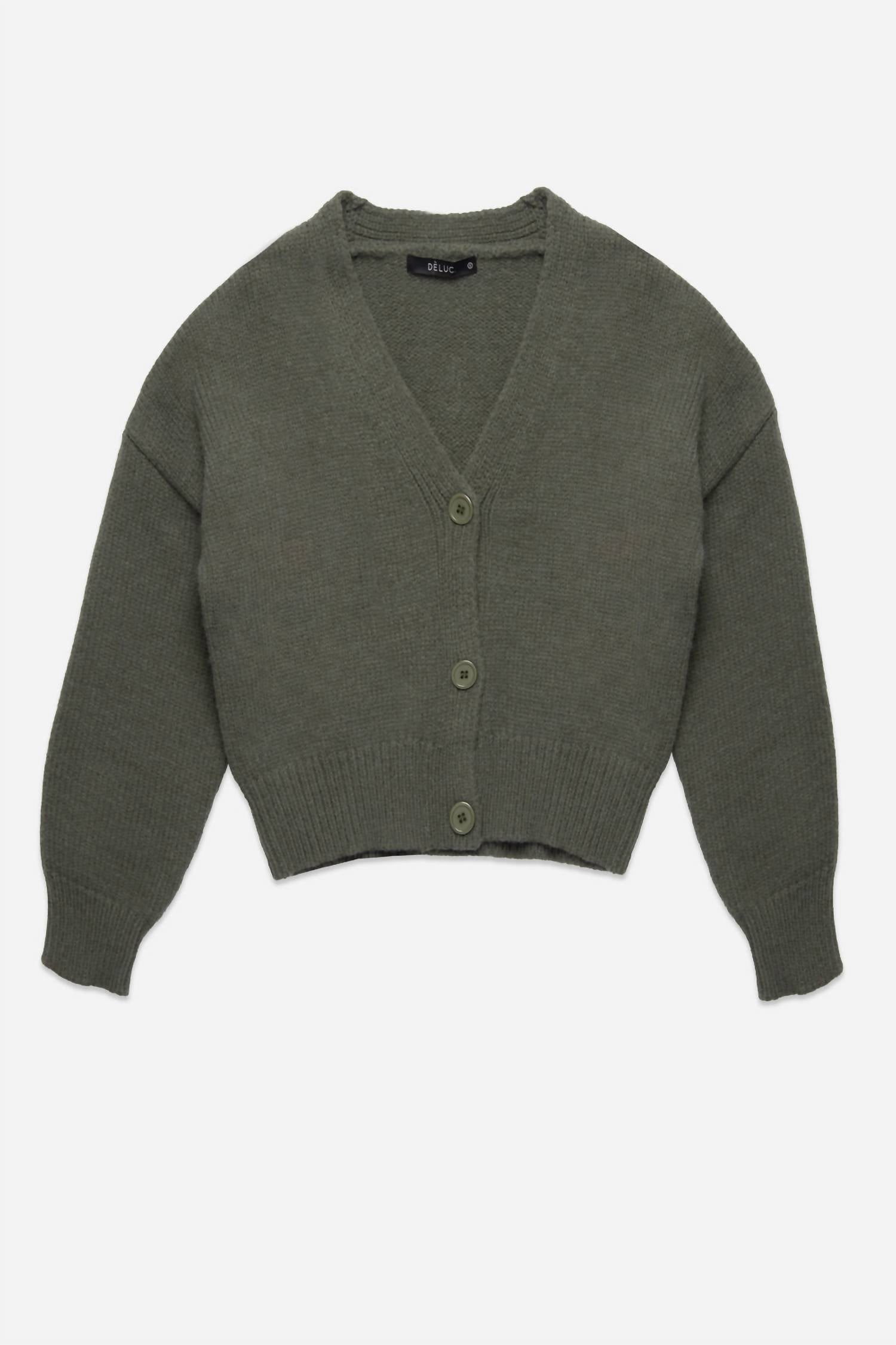 A classic fit that works just as good buttoned as it does left open. Elevate your wardrobe with the Phineas V-neck Cardigan by DELUC, an ideal piece for minimalist styling this fall. Designed in a solid army color, this cardigan features long sleeves that beautifully complement its flattering V-neckline. Made from soft acrylic, it offers a delightful combination of playfulness and warmth. Closure: Button closure. Care: Hand wash, lay flat to dry, ensuring longevity and comfort season after season.
