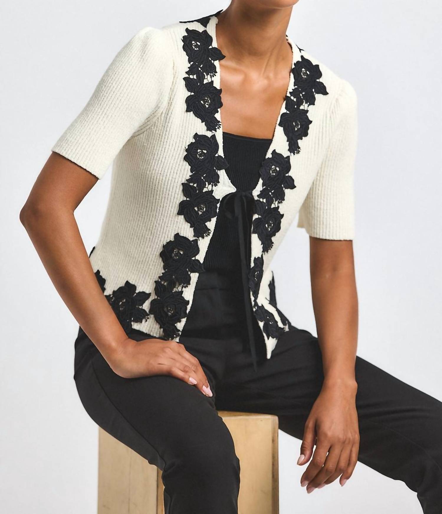 A classic fit that works just as good buttoned as it does left open. Introducing the Maes Cardigan by Derek Lam 10 Crosby, a delightful blend of elegance and playfulness in black and white. This short-sleeve cardigan is crafted with textured, ribbed yarn and features a floral-patterned guipure lace trim, highlighting its unique character. The gathered shoulders and V-neckline add a sophisticated touch, while the single tie closure at the front ensures a relaxed fit. Ideal for spring holiday parties, this piece seamlessly integrates into any stylish wardrobe.