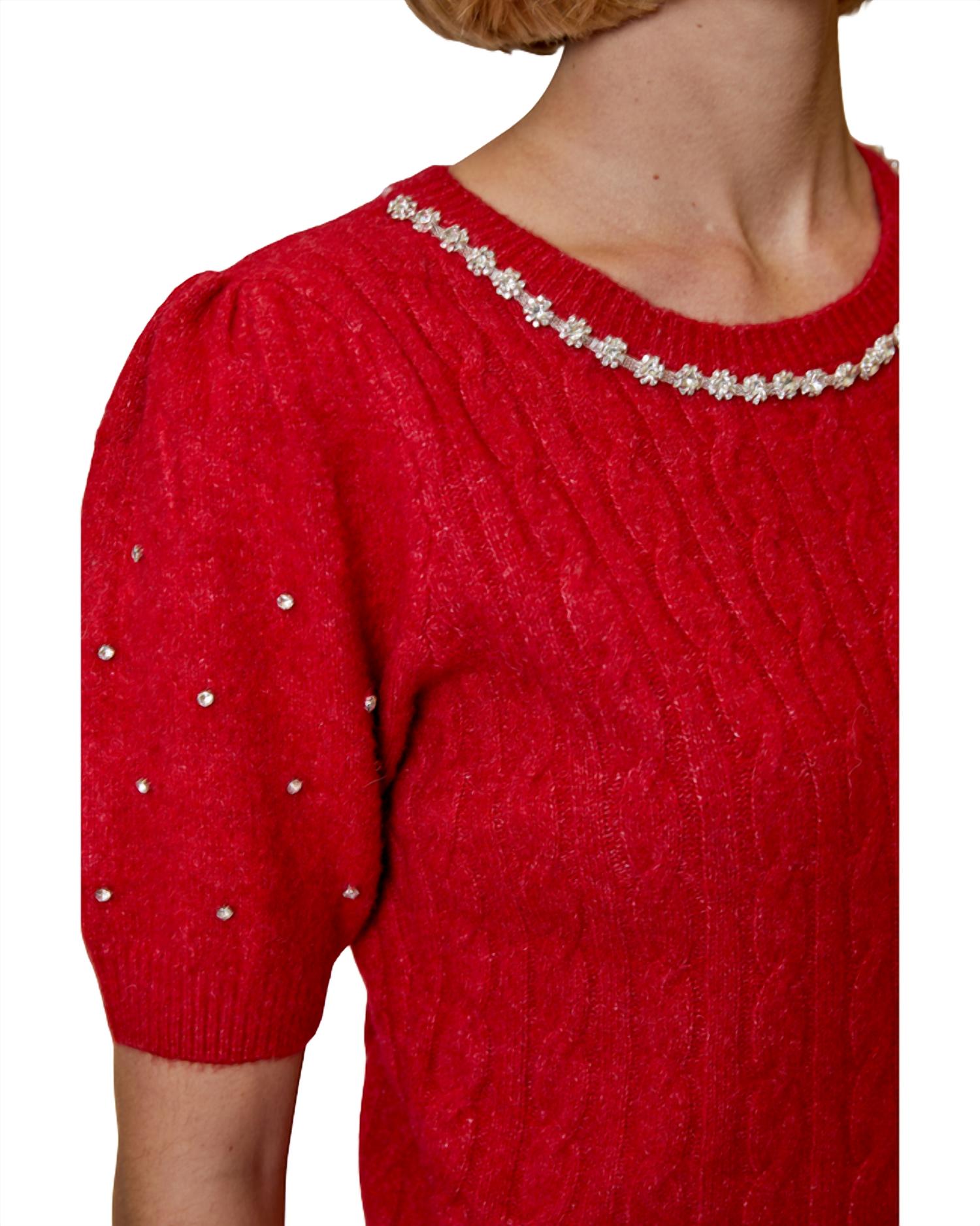 Stay warm and stylish in this versatile and effortlessly cool knitwear staple. Wear it alone or layered, it's the perfect sweater for the season and you'll wish you had it in every color. Introducing the Rhinestone Sleeve Sweater by DESIGN HISTORY, a delightful addition to your fall wardrobe. This textured, short sleeve sweater in vibrant cherry features dazzling rhinestone accents along the sleeves for a touch of glam. Made for women, this crewneck design is perfect for adding a fun pop to chilly days. Machine wash, tumble dry.