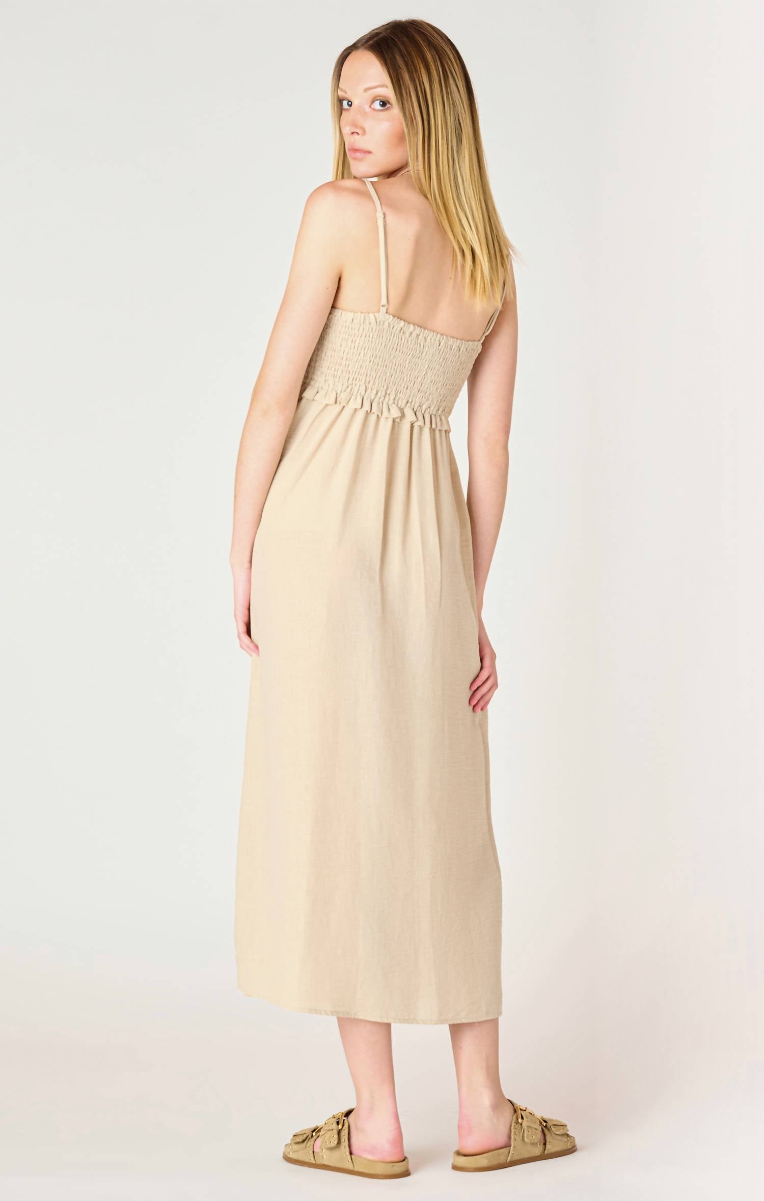 Just add slides or mules and you are good to go. Introducing the Bead Detail Midi Dress by Dex, a chic beige dress perfect for summer vacations and boho-chic occasions. This solid A-line silhouette features a stylish squareneck and is entirely sleeveless for a breeze-catching effect. With its pull-on closure, this dress ensures easy and comfortable wear, making it a must-have for effortless style. As it is devoid of pockets and care instructions, it's all about minimalist elegance and ease.