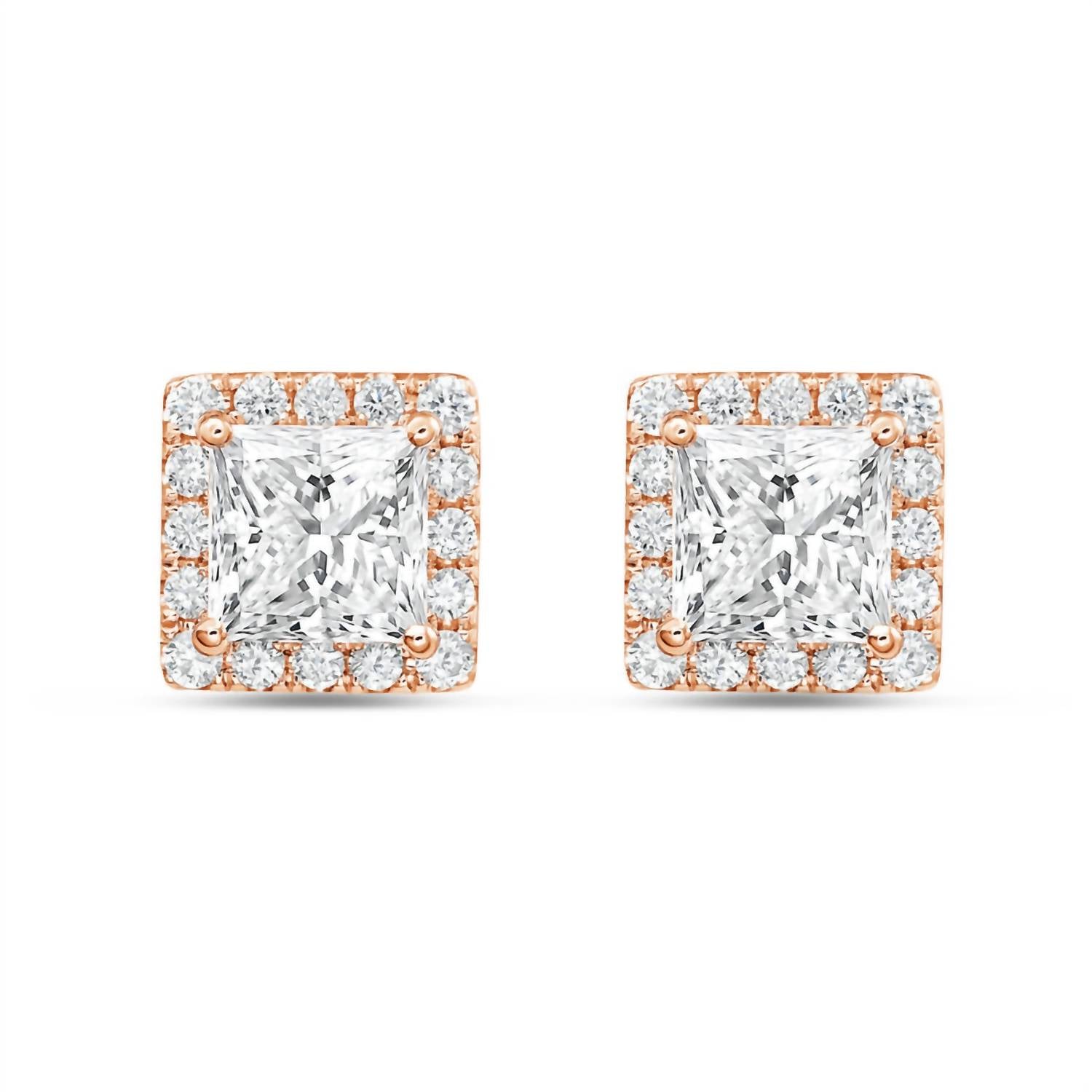 Classic earrings that will take you from season to season. Elevate your elegance with the Women's Princess Lab-Grown Diamond Stud Earrings by Diana M Jewels. These fine earrings feature a stunning 3.00 ct total weight of lab-grown princess-cut diamonds, set in 14kt rose gold with an excellent cut quality. The post clasp ensures a secure fit, while the prong setting elegantly showcases each diamond's brilliance. Complete with an original box, these earrings are a timeless addition to any collection.