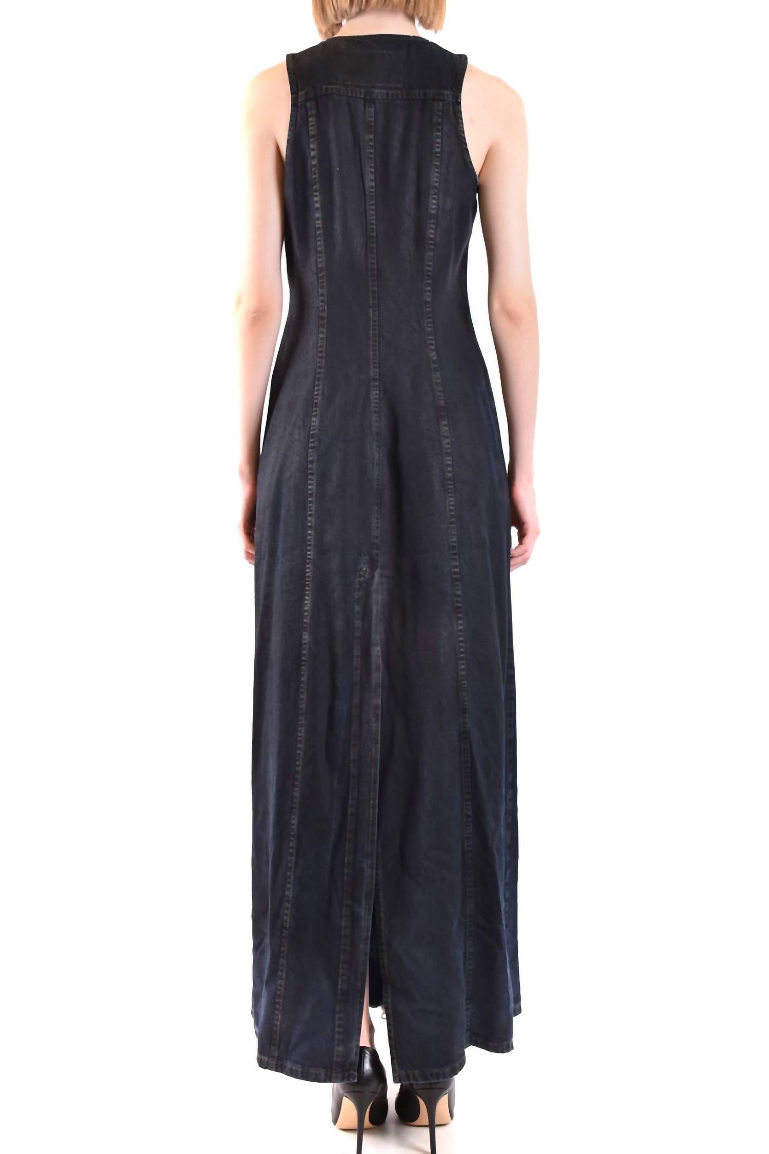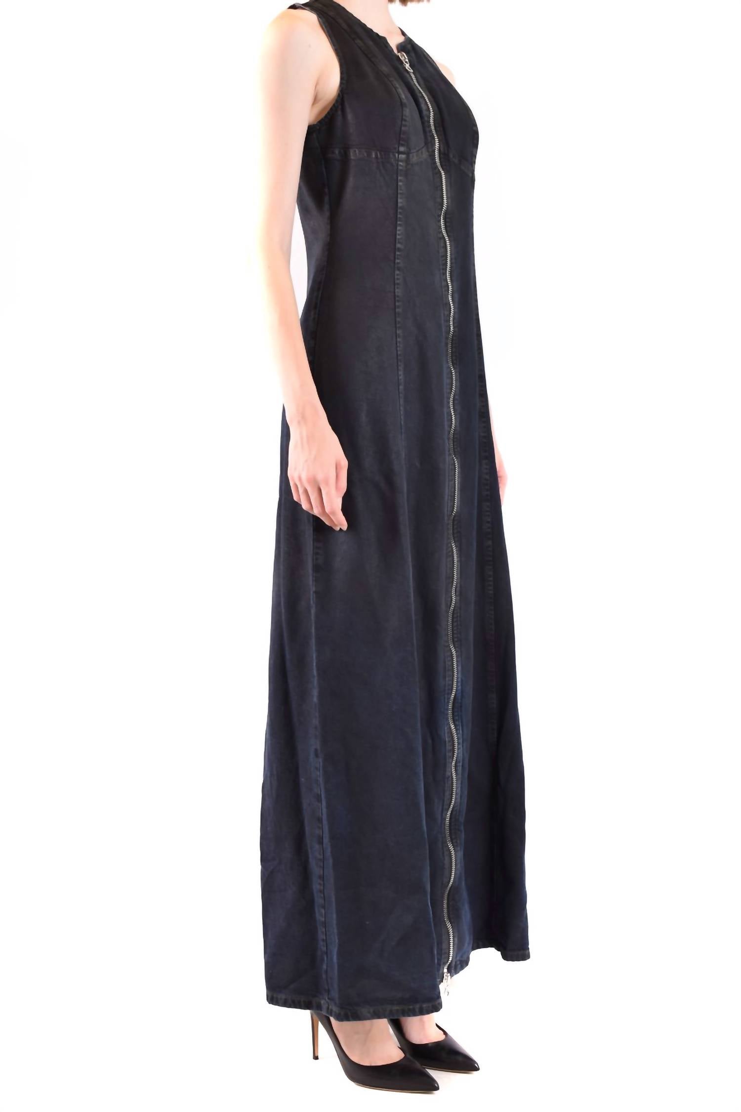 Style this maxi with your favorite statement necklace and sandals for the perfect look. Introducing DIESEL's Sleeveless Denim Maxi Dress, a sophisticated choice for evening events. This black, solid-patterned dress features a crewneck design and an A-line silhouette, enhanced by a back slit for added elegance. Crafted entirely from 100% lyocell denim, it offers a sleek zip closure. Perfect for fall, this vintage-inspired piece offers timeless appeal without the fuss of added pockets.