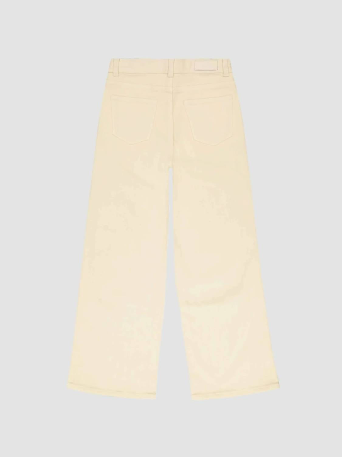 The "Girls Lily Wide Leg Jeans" by DL1961 - Kids' make a stylish addition to your little one's wardrobe, crafted in a crisp off-white Manilla hue. These jeans have a high-rise waist, a classic fit, and a relaxed wide leg with a cropped inseam, complemented by a zip closure for easy wear. Made from 67% Cotton, 32% TENCELâ„¢ Lyocell, and 1% Lycra, they boast the DL Ultimateâ„¢ denim blend for softness, breathability, and high-retention stretch. Care is simple with machine wash and tumble dry instructions, perfect for the minimalist spring back-to-school trend.