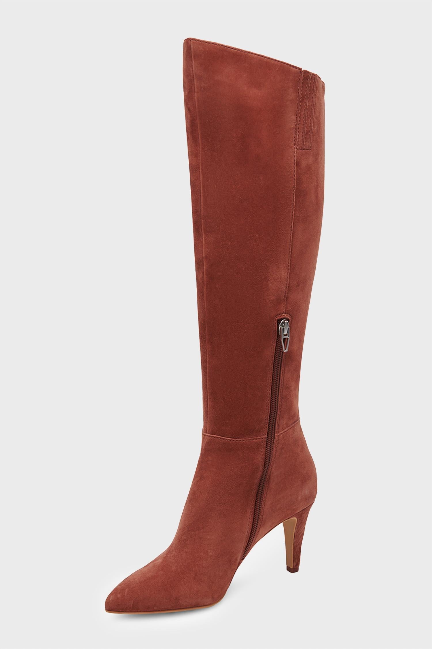 A stylish boot with a comfortable fit and the perfect amount of height. These classic boots are the perfect addition to any outfit and can be worn season after season. Step out in style this fall with the Women's Haze Boot by Dolce Vita, featuring a chic stiletto heel and a tall 17.3-inch shaft. Crafted from luxurious cinnamon suede, these boots offer a sleek pointed toe and a medium width for a comfortable fit. The 2.9-inch kitten heel provides just the right amount of lift for your holiday parties and preppy outings. Designed for confident, fashion-forward moments, they are the perfect choice for any stylish ensemble.
