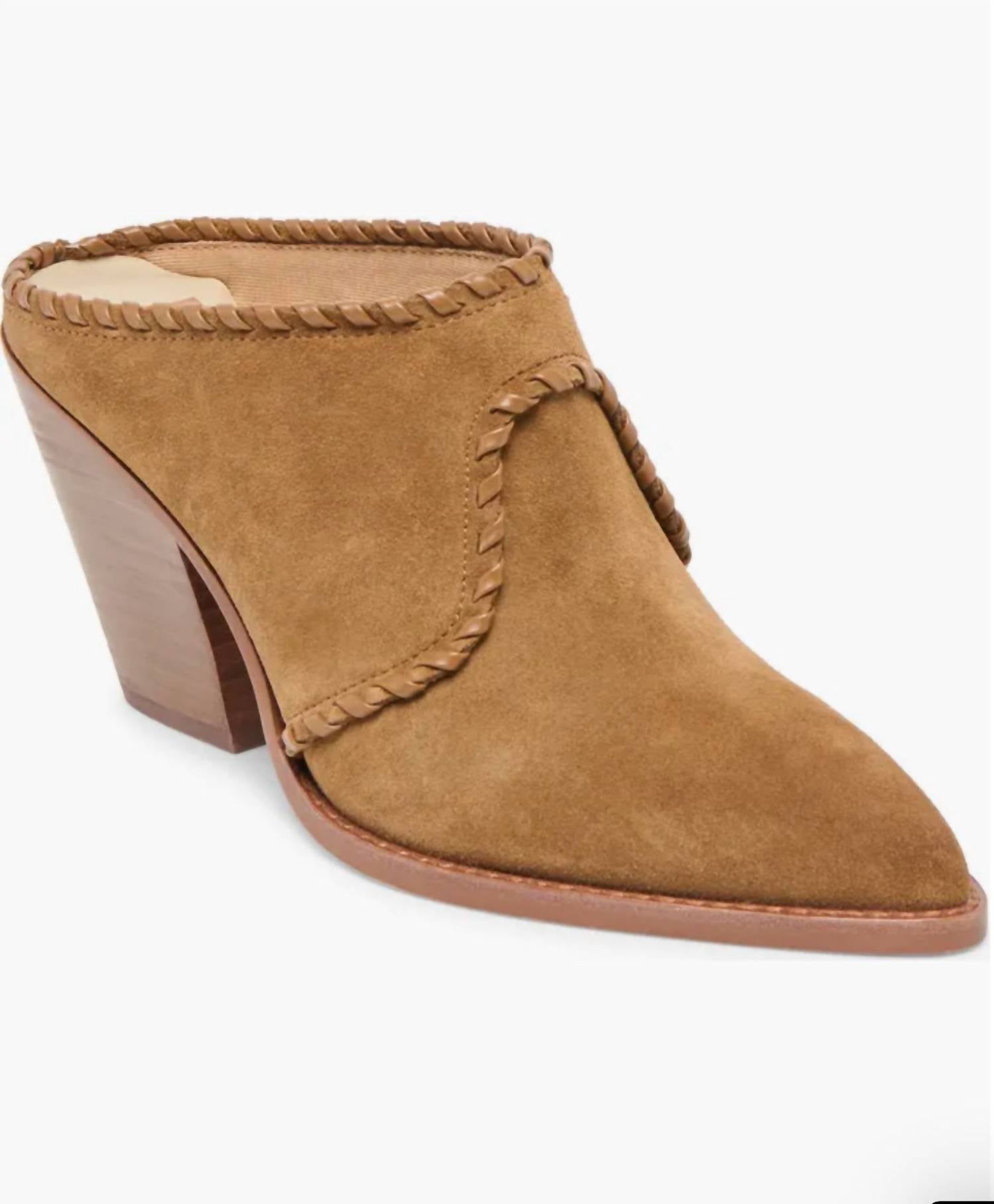 Slip them on and go! Step into the spotlight with the Women's Jolyn Western Mules by Dolce Vita, an exquisite blend of western charm and contemporary edge in light brown suede. These mules feature a unique metallic toe cap and intricate braided detailing, crafted with a luxurious calf hair and leather upper. The shoe is finished with a recycled synthetic outsole, a recycled textile lining, and a water-based leather alternative sock for eco-friendly style. Heel height stands at 3.2 inches, perfect for adding flair to your ensemble, while the block heel ensures comfort and stability.