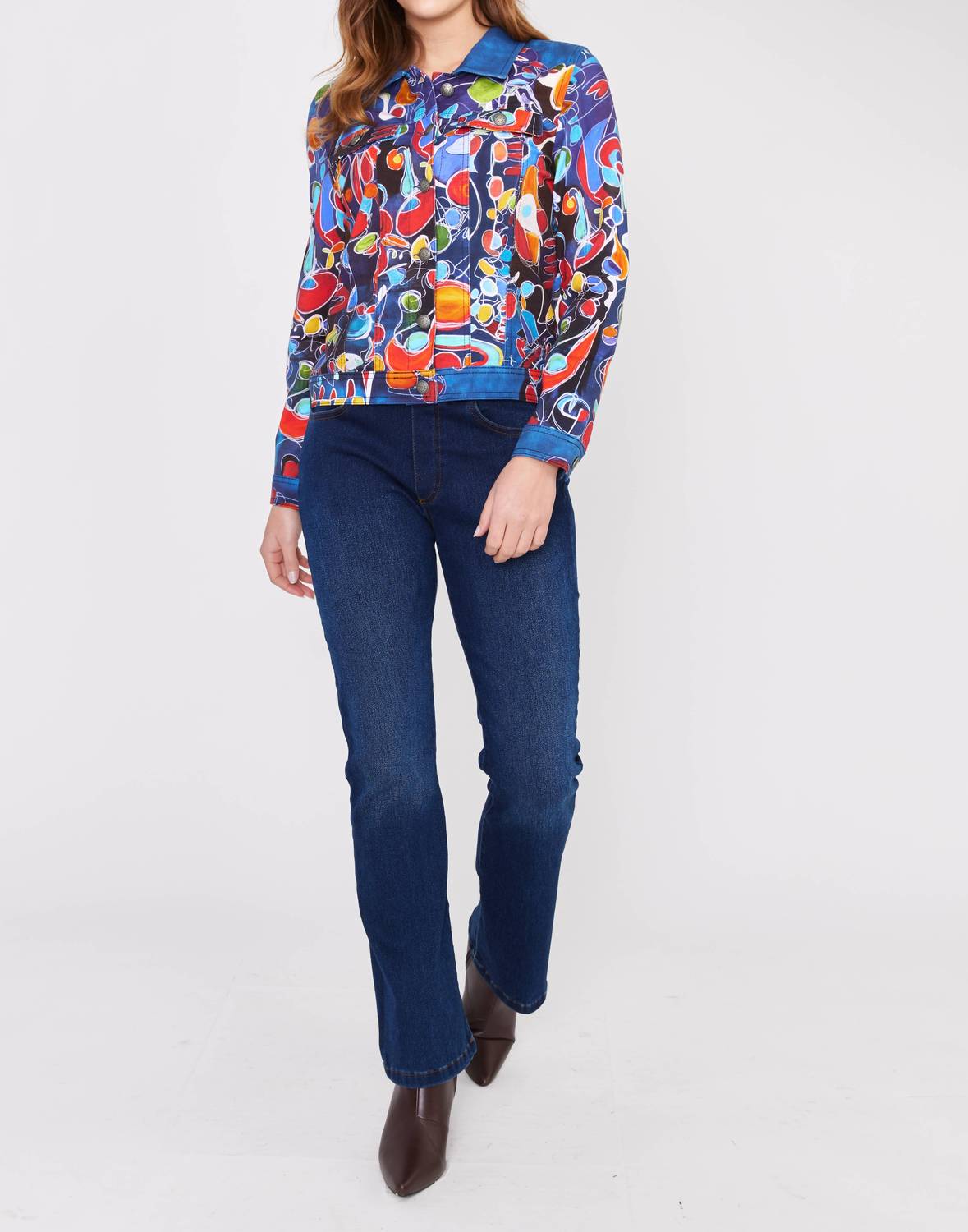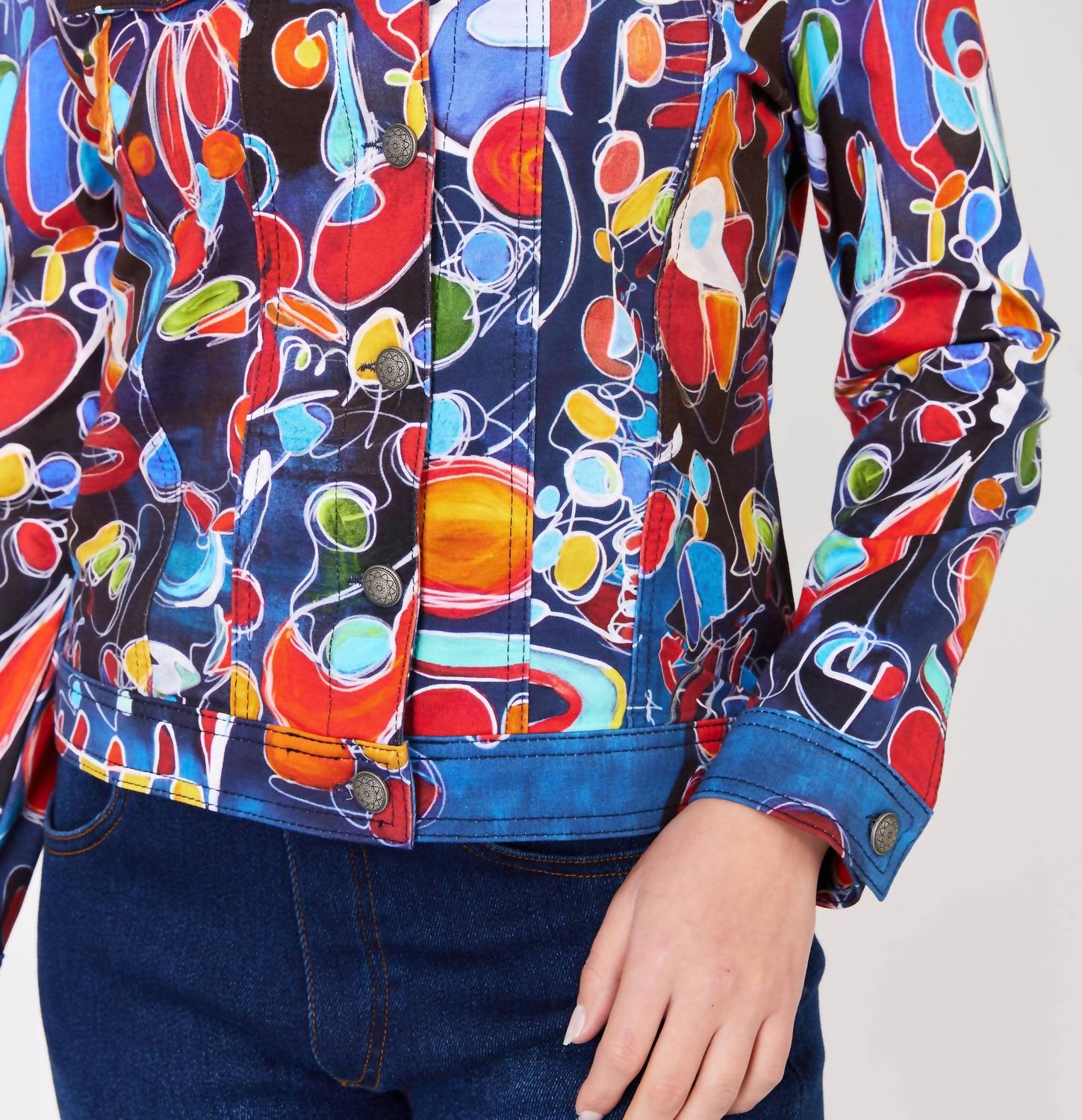 Throw this adorable jacket over just about anything for an effortlessly stylish look. Elevate your wardrobe with the Dolcezza Simply Art Provencal Market Nathalie Gribinski Jacket, a vivid masterpiece that seamlessly blends style and comfort. Featuring full-length sleeves and a classic collar, this jean jacket boasts an all-over pattern from the artistic mind of Natalie Gribinski, making each piece a unique statement. Crafted in a cotton blend with a composition of 75% Cotton, 15% Polyester, and 10% Elastane, it offers flexibility and comfort with a touch of flair through its decorative button closure and faux pockets. Measuring approximately 21 inches in length, it is a perfect canvas for artistic expression and should be gently hand washed to maintain its vibrant blue, red, green, and orange hues.