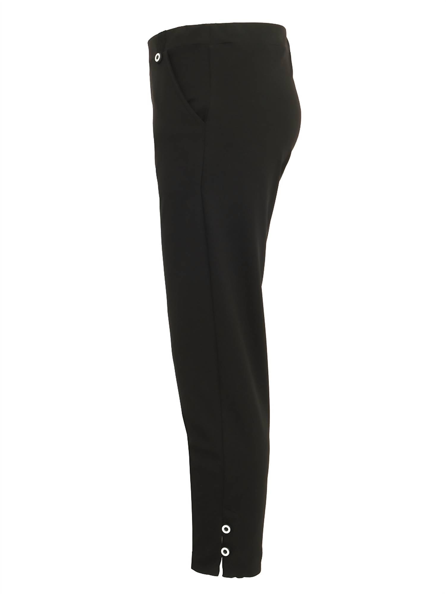 Pull on. Fake fly. Stretch Cotton/Poly/Elastane fabrics. Accent white buttons at waist and hemline.