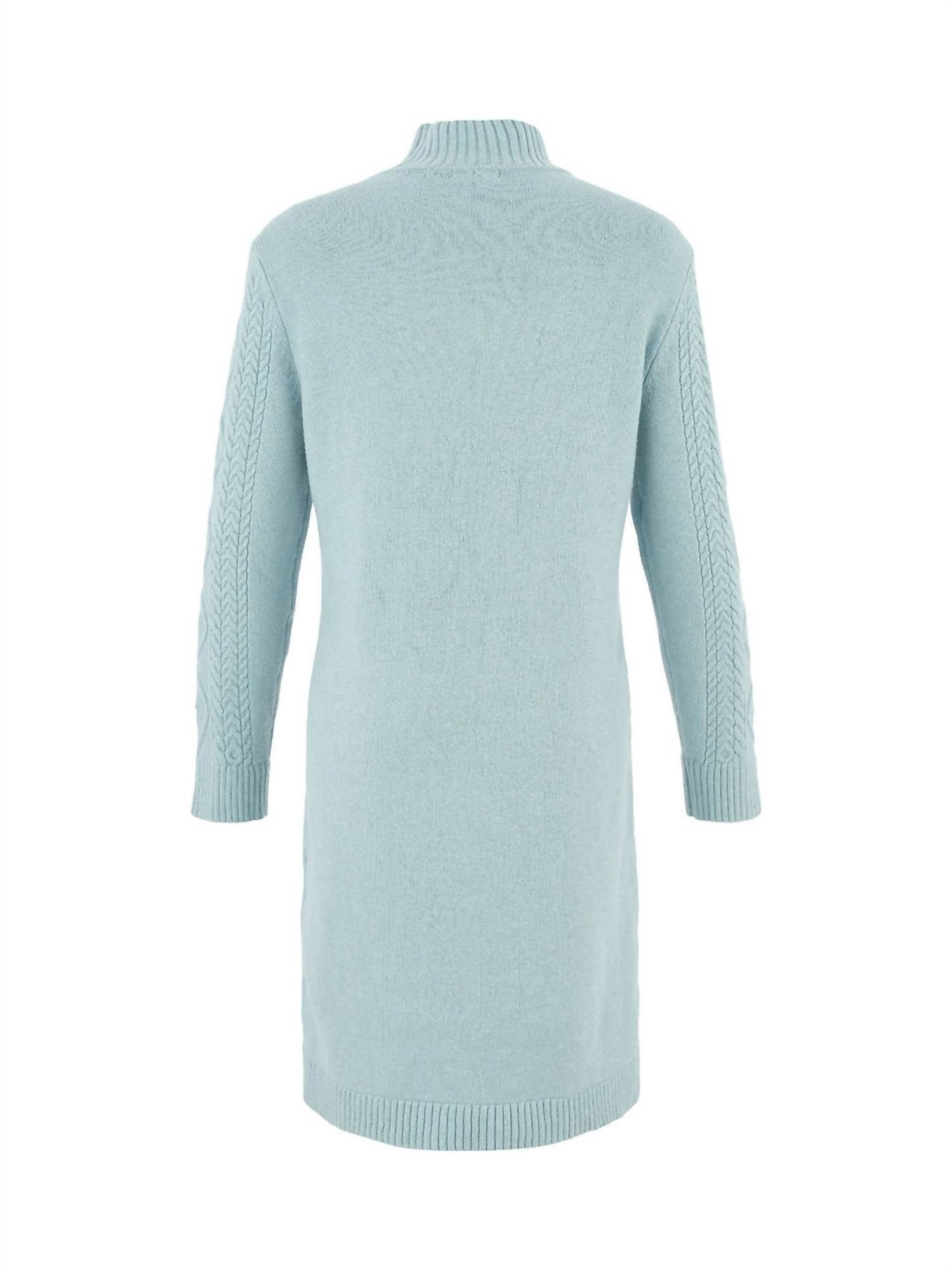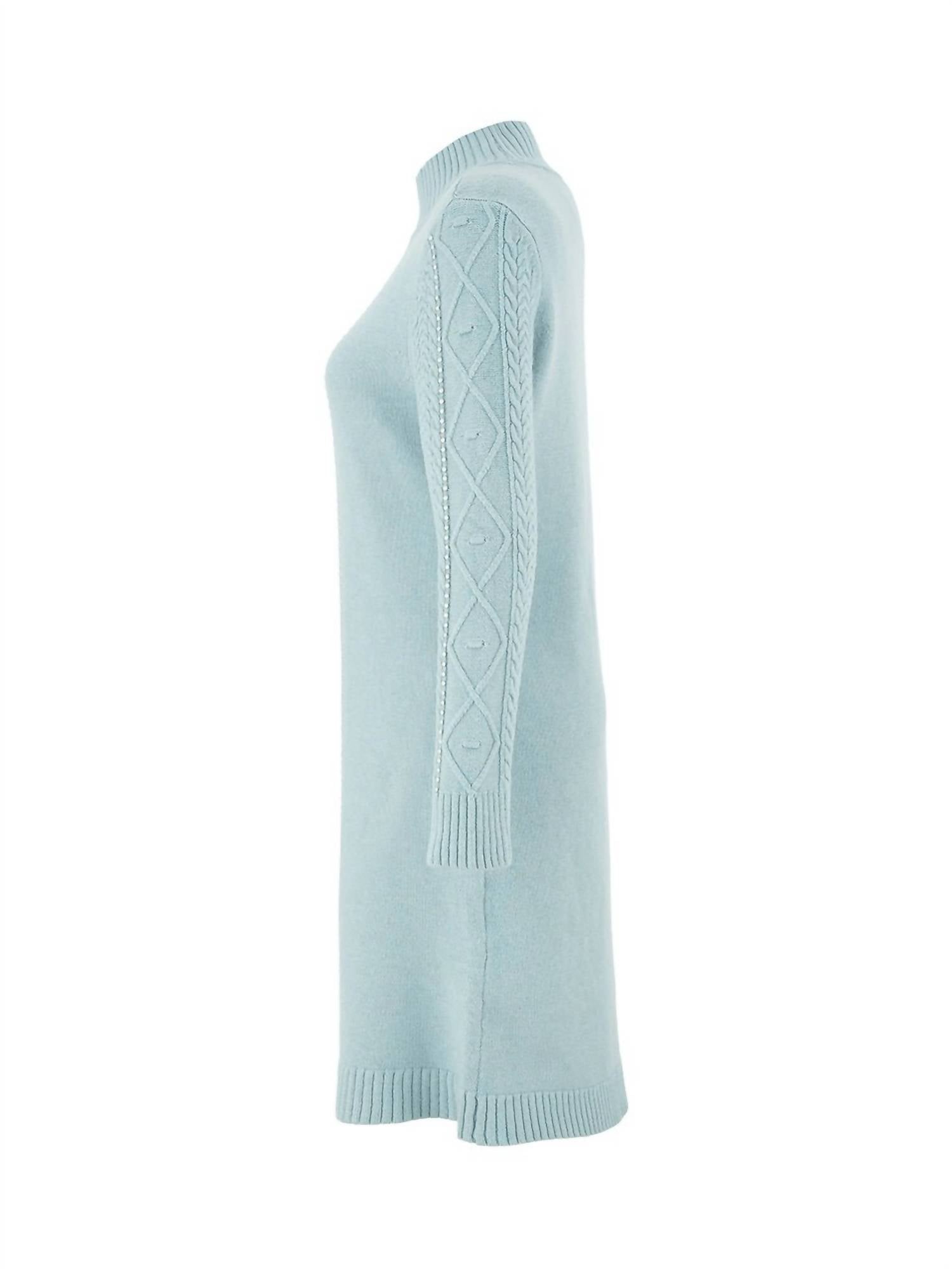 Comfortable and cute, this casual day dress has it all. Elevate your wardrobe with the Embellished Long Knit Dress by Dolcezza in a sophisticated seafoam blue hue. This dress showcases long sleeves and a refined turtleneck, crafted from a luxurious blend of 42% Polyester, 28% PBT, 18% Acrylic, and 12% Nylon. The dress features an exquisite braided and geometric knit design, enhanced with decorative stud embellishments. Designed for a true-to-size fit, this pull-on sheath silhouette is perfect for fall, embodying minimalist elegance ideal for any holiday party.