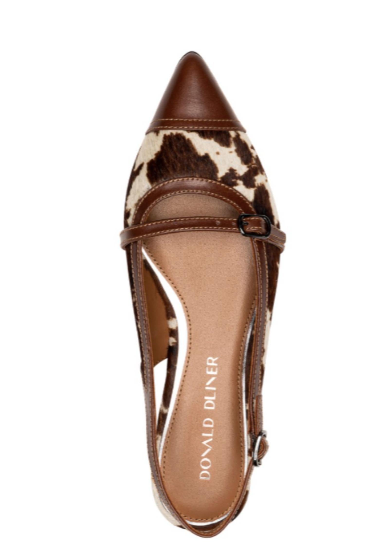 A preppy yet feminine take on the classic loafer. Introducing the women's Rozamay Slingback Flat by Donald Pliner, a stylish addition to your summer wardrobe in a Saddle hue. These flats feature a sleek pointed cap toe with a haircalf upper and leather trim, combined with an adjustable buckle closure for a secure fit. The leather sock lining and buffed leather and rubber outsole ensure a comfortable, non-slip experience. Perfect for a boho-chic vacation look. Imported.