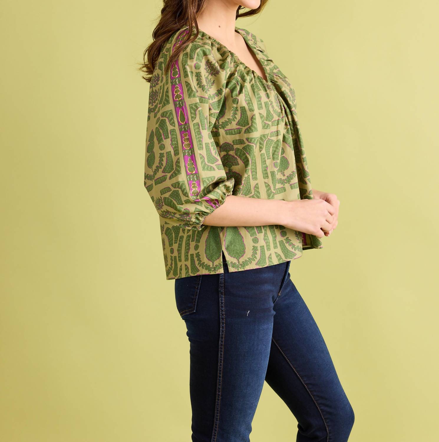 A timeless blouse that will never go out of style. Introducing the Beatrice Top by Double A, a chic statement piece with three-quarter sleeves and a flattering V-neckline. Made from 100% cotton poplin, this blouse boasts a relaxed fit with vibrant red, blue, mustard, and green florals against a deep background. The elastic cuffs provide an easy and comfortable wear, making it perfect for both daytime and dressier occasions. Closure: Pullover style.
