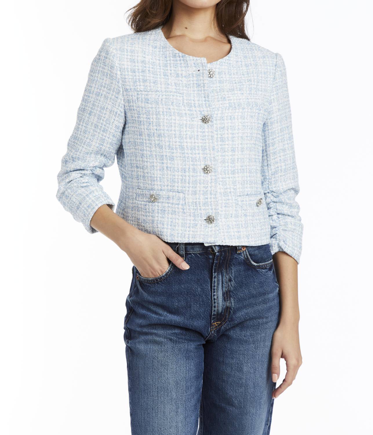 Cute, casual, and comfortable. This jacket is a must have. The Halo Tweed Jacket by DREW in a sky hue is a preppy essential for your travel wardrobe. Featuring a stylish patterned design, this casual jacket includes three-quarter sleeves and a classic crewneck. Crafted for summer occasions, its button closure and pocket details offer both functionality and style. Care for this piece by dry cleaning only to maintain its pristine condition.