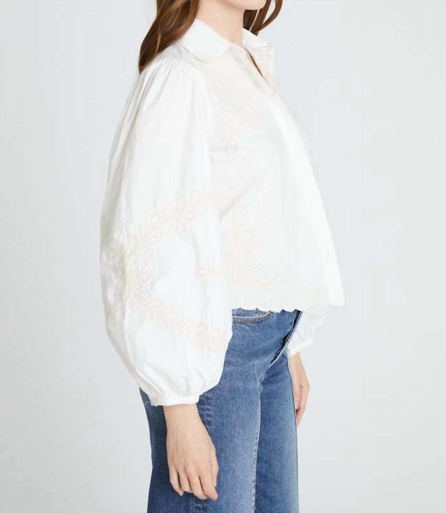 A classic button down shirt that will never go out of style. Experience the charm of Western-inspired elegance with the Poplin Top by DRIFTWOOD in Raised Rodeo. Featuring long sleeves and crafted from 100% cotton, this white button-down shirt boasts soft tonal embroidery along the shoulders, sleeves, and hem, with scalloped edges and billowy balloon sleeves for a feminine touch. Closure: Button closure. Ideal for a day-to-night transition, this breathable and polished piece easily pairs with denim for a chic, boho-inspired look.
