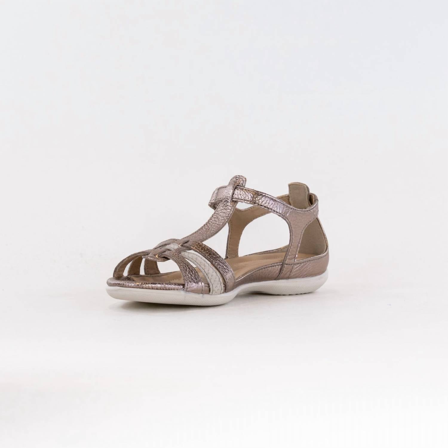 Flowy dresses, cropped pants, and even jumpsuits... this sandal works with them all! Embrace comfort and style with the ECCO Women's Flash T-Strap Sandal in Warm Grey Metallic/Moon Rock, perfect for a Boho Chic summer look. Crafted from rich, natural leather, these sandals are lightweight and breathable, featuring a leather lining for a perfect inner climate. Designed with a leather-covered EVA-molded footbed, they provide excellent cushioning, and the direct-injected PU outsole offers a durable and flexible finish. The sandal boasts a fully adjustable buckle closure, ensuring a comfortable fit for all your vacation adventures.