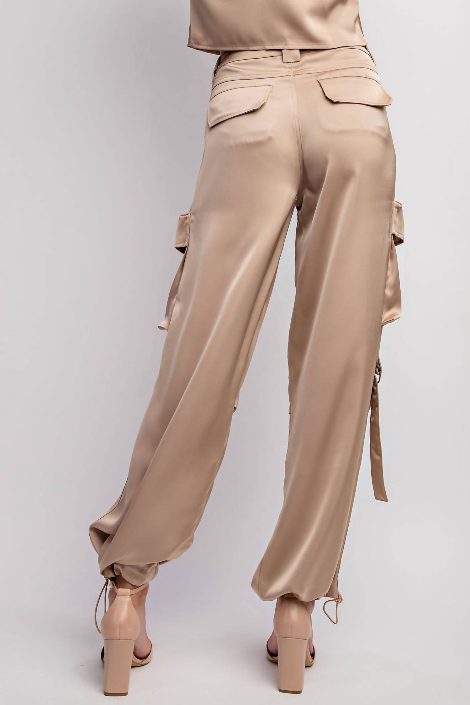 Explore the minimalist trend with Edit by Nine's Satin Cargo Pants in elegant light grey, tailored for summer engagements. These wide-leg pants boast a high-rise waist with a relaxed fit, making them both stylish and comfortable. They feature a hook and eye closure and practical pockets, perfect for carrying essentials. Ideal for a sophisticated yet casual holiday look.