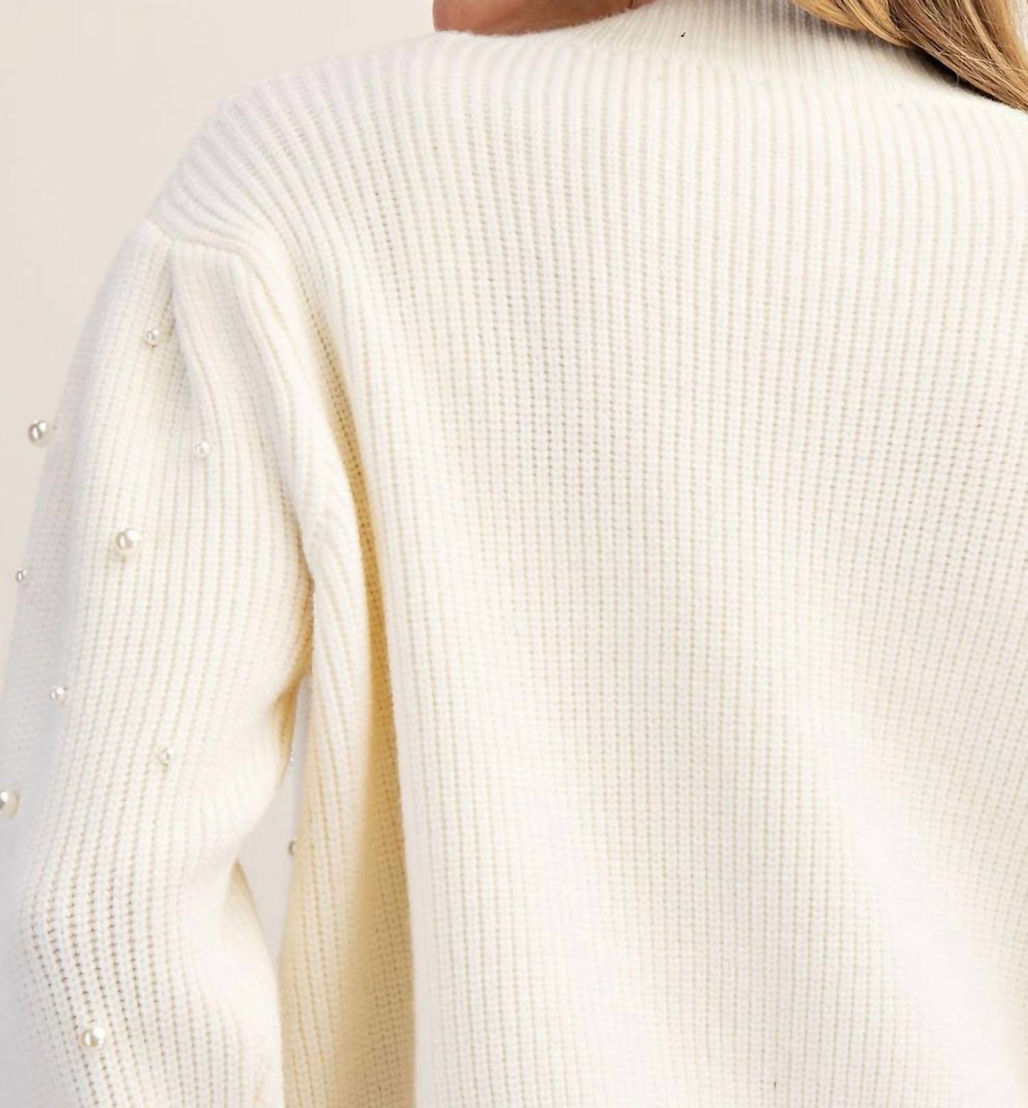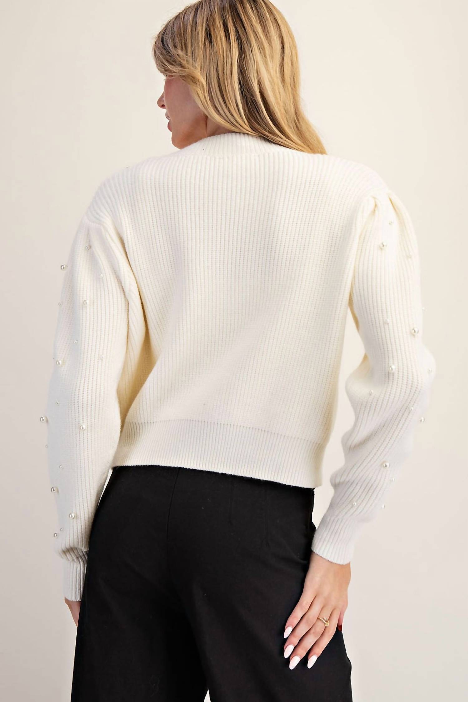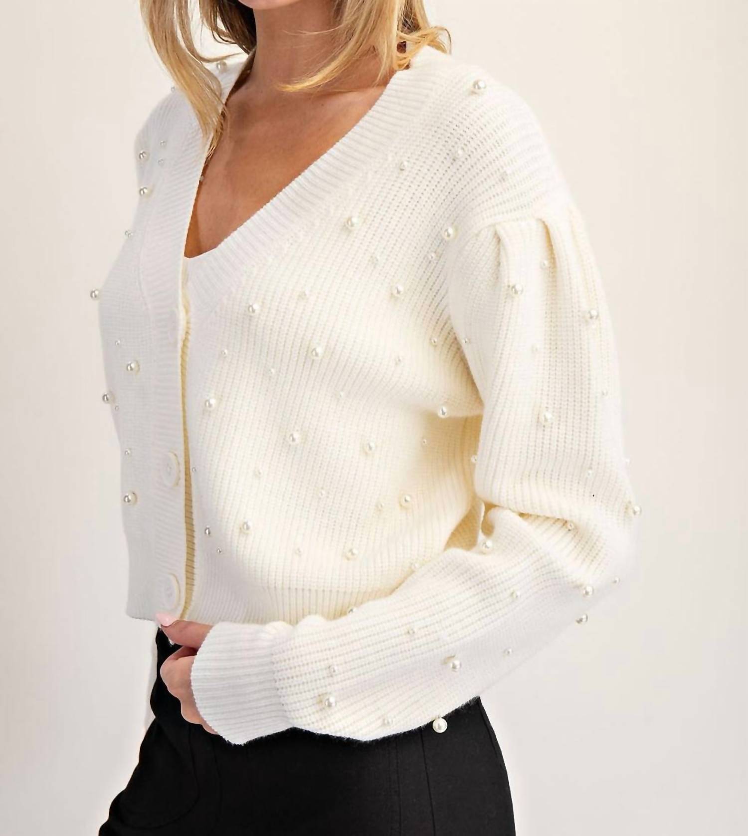 Throw this adorable cardigan over any cami or tank top. Elevate your fall wardrobe with the Pearl Long Sleeve Cardigan by ee:some in a soft, solid cream. This cardigan showcases a long sleeve design and features pearl embellishments on a ribbed viscose blend body with a deep V-neckline. Its cropped silhouette with dropped shoulders and subtly puffed sleeves adds an elevated twist on cozy elegance, closed with tonal buttons. Crafted from 50% Viscose, 30% Polyester, and 20% Nylon, this piece is made for luxurious comfort. For care, simply hand wash to maintain its pristine appearance, and note that the model, standing at 5'8", wears a small.