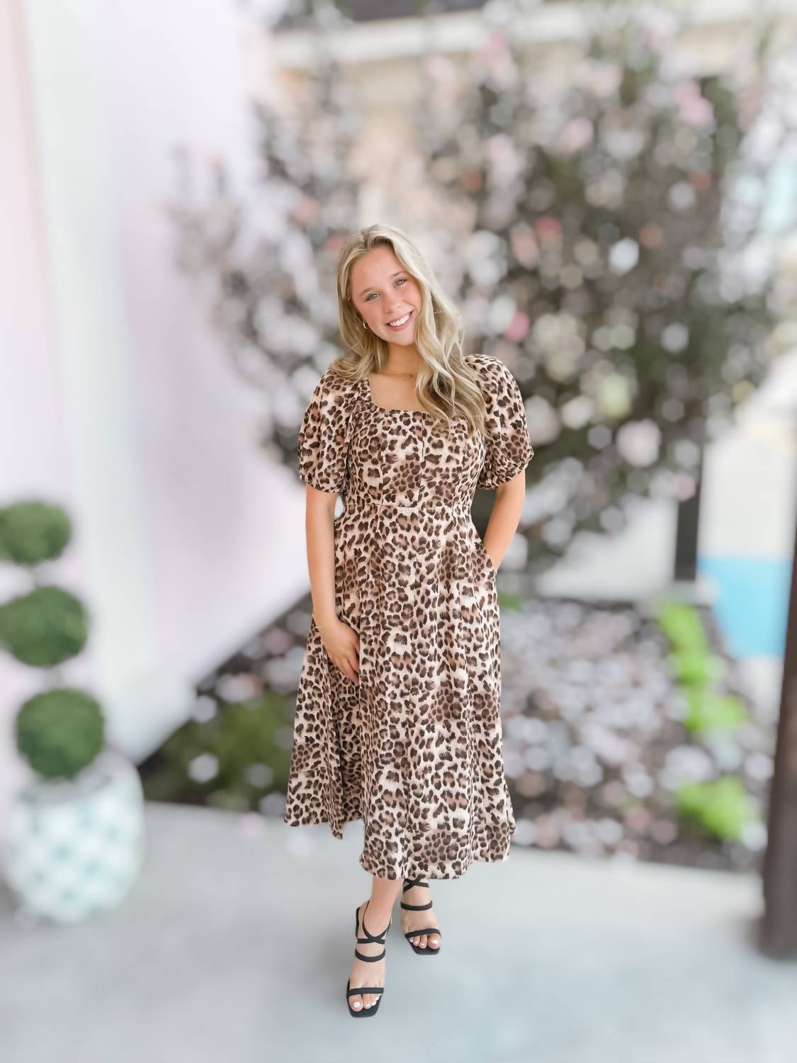 Style this maxi with your favorite statement necklace and sandals for the perfect look. Introducing the Women's Wild Graces Printed Midi Dress by ee:some, a chic choice for a summer vacation. This sheath dress in a striking leopard print features short sleeves and a stylish squareneck design. Crafted for convenient wear with a pull-on closure, it embodies maximalist trends with its eye-catching animal pattern. Perfect for sun-drenched escapades, this dress is a blend of elegance and ease for any warm-weather occasion.