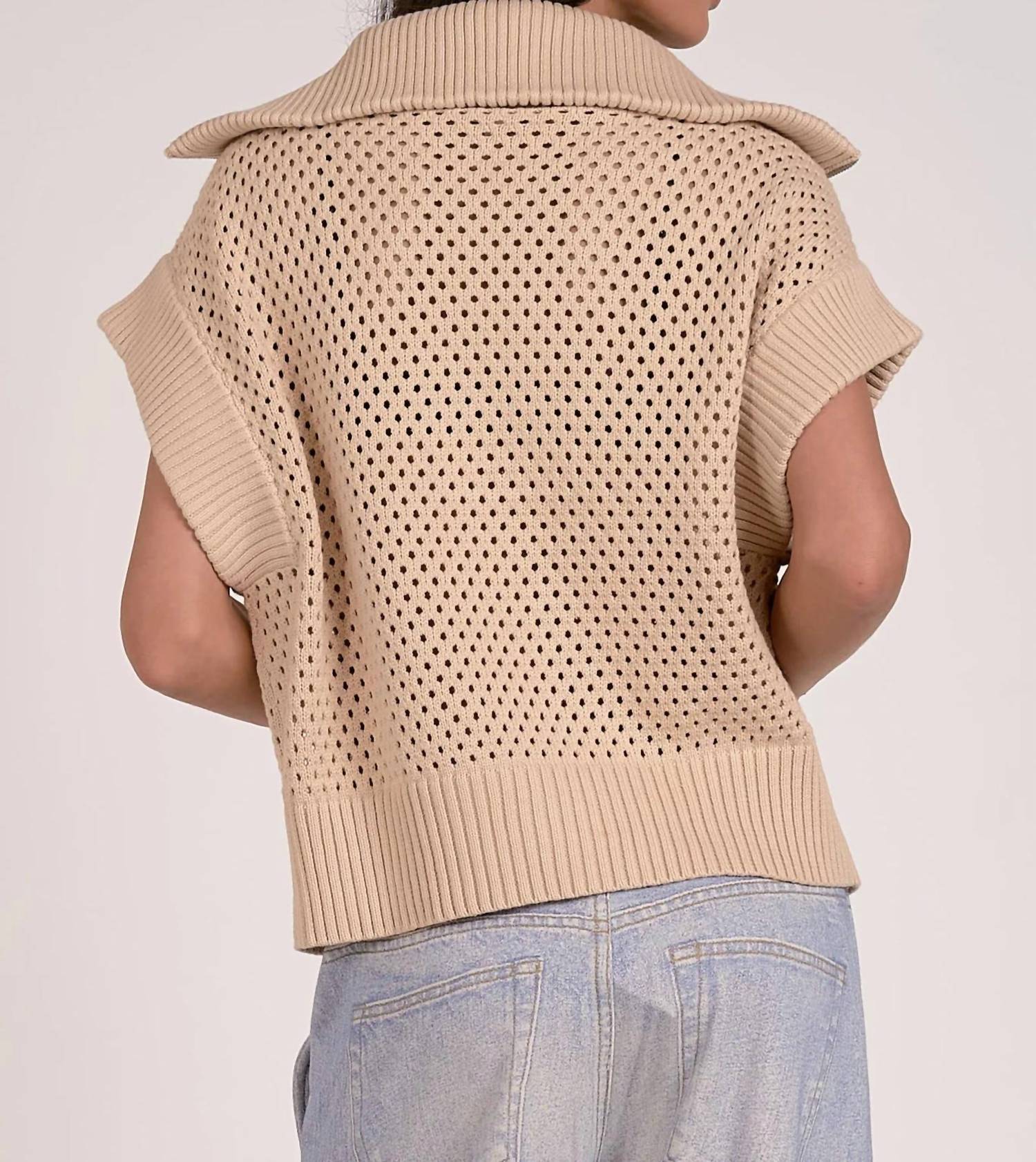 A classic fit that works just as good buttoned as it does left open. Elevate your seasonal wardrobe with the Allie Zip Up Sweater by ELAN, a chic blend of style and comfort in a textured sand hue. This cotton sweater features short sleeves and an oversized collar for a modern twist on the classic cardigan, ideal for vacation outings. Crafted without pockets for a sleek profile, it closes securely with a 1/4 zip.