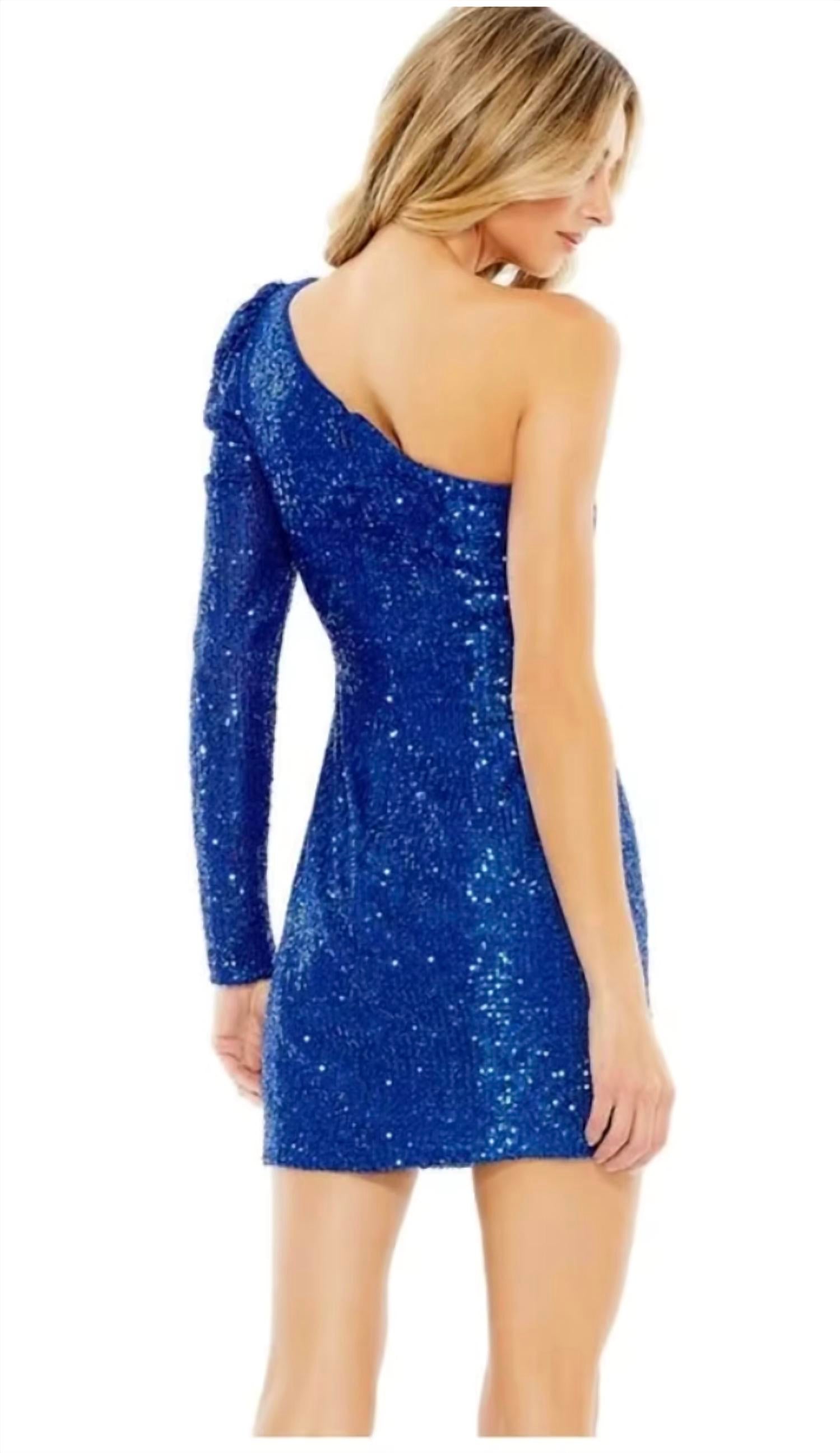 The kind of easy and flattering dress you'll be reaching for all season long. This fitted mini dress is designed to shine, crafted from shimmering sequins for a bold party-ready look. The one-shoulder neckline and single sleeve create a striking asymmetrical silhouette, while a sleek slit adds a touch of allure. Finished with a back zipper for easy wear, it’s the perfect choice for cocktail events and special nights out.