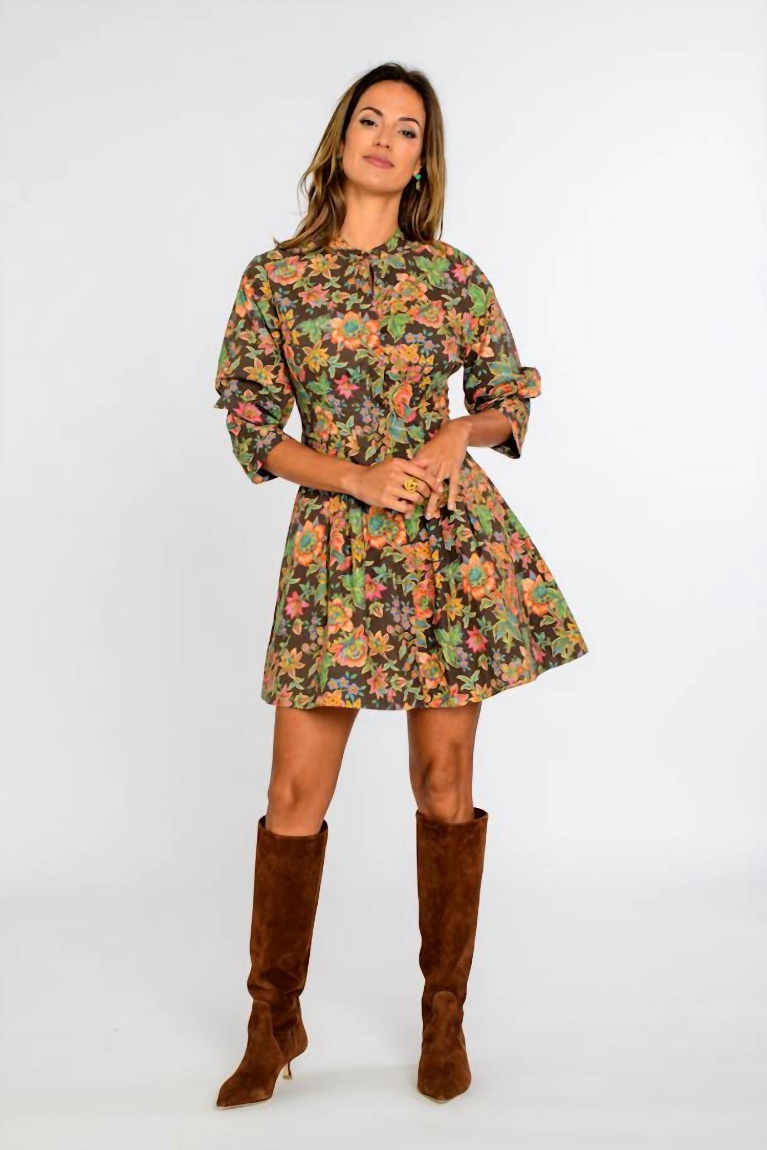 The perfect mini dress for those warmer months. Introducing the Cameron Printed Dress by Elizabeth James The Label, an embodiment of boho chic style in stunning Wallflower Brown. This mini A-line dress boasts three-quarter gathered sleeves and a stitched down pleated waist, featuring a collar neckline for a touch of elegance. Made from 100% cotton, it includes a convenient button closure and an optional matching belt to enhance its versatility. Care instructions: Machine wash on cold, gentle cycle; line dry; warm iron as needed; dry clean optional.