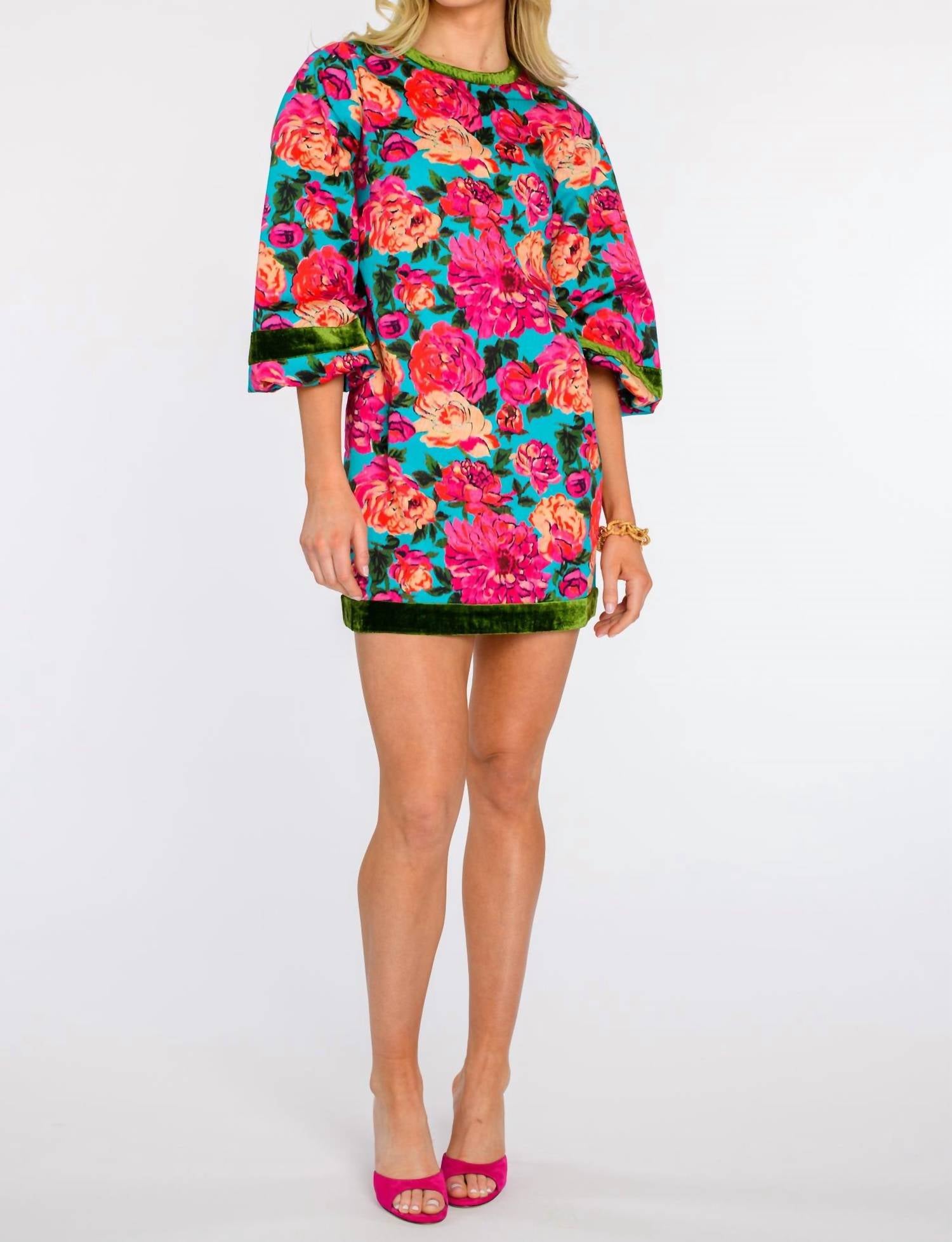 The kind of easy and flattering dress you'll be reaching for all season long. Embrace the timeless elegance of the London Mini Dress by Elizabeth James The Label, crafted from a cotton blend for comfort and style. This chic shift silhouette features three-quarter balloon sleeves with a playful bubble hem and luxurious velvet trim, all blooming with a Vintage Roses floral pattern. Closure: Zip closure. Ideal for your spring getaways or Easter gatherings, this dress is a versatile addition to your wardrobe with its delightful vintage flair.