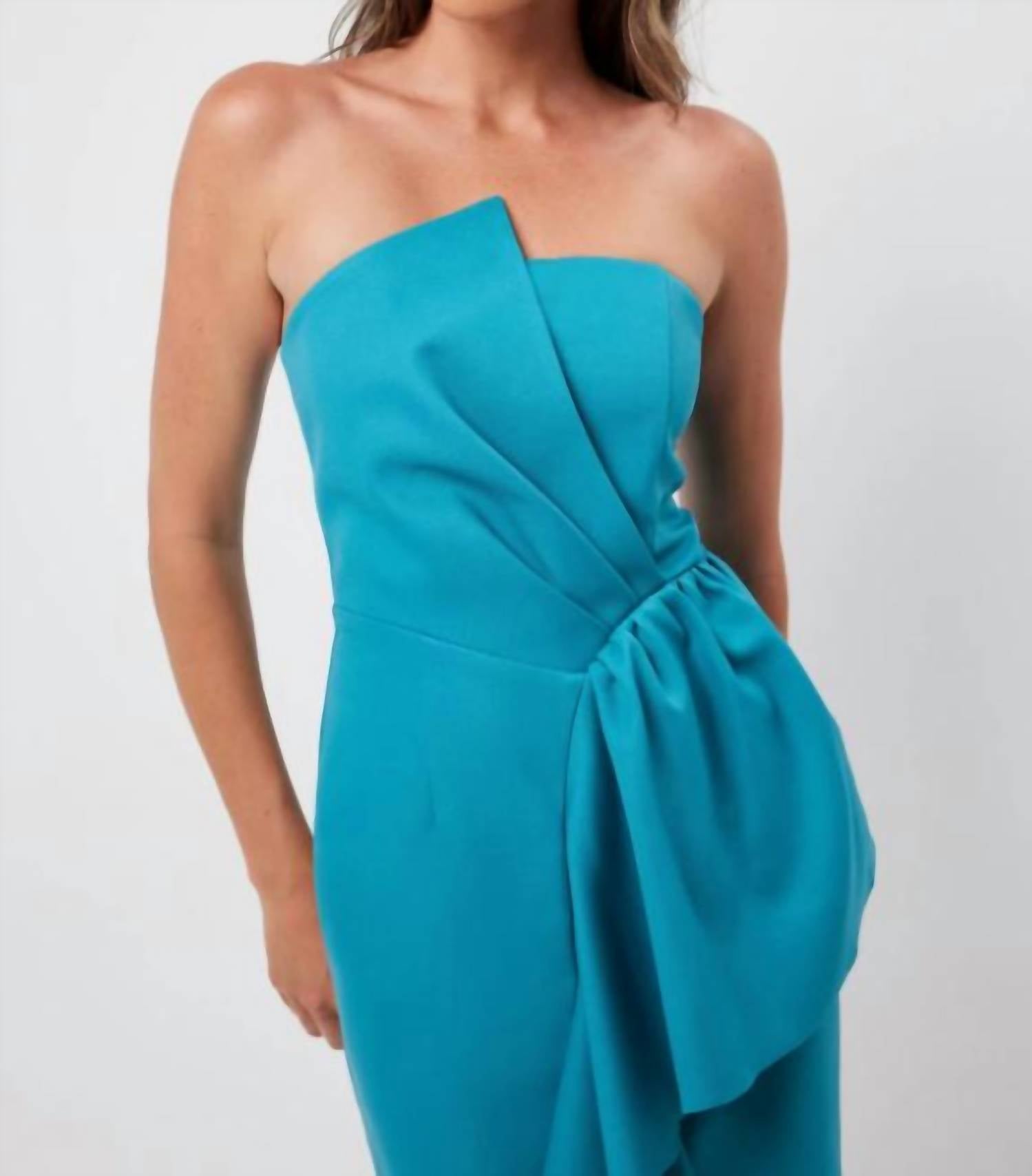 A midi dress so versatile, your options for wearing it are endless. Introducing the Ayla Midi Dress by ELLIATT, a captivating choice in a solid turquoise perfect for summer holiday parties. This strapless sheath silhouette features an off-the-shoulder neckline and a pleated waterfall front that ensures you stand out. Made from 100% Polyester, it offers a sleek zip closure for ease of wear. For longevity, this stunning piece requires dry cleaning.