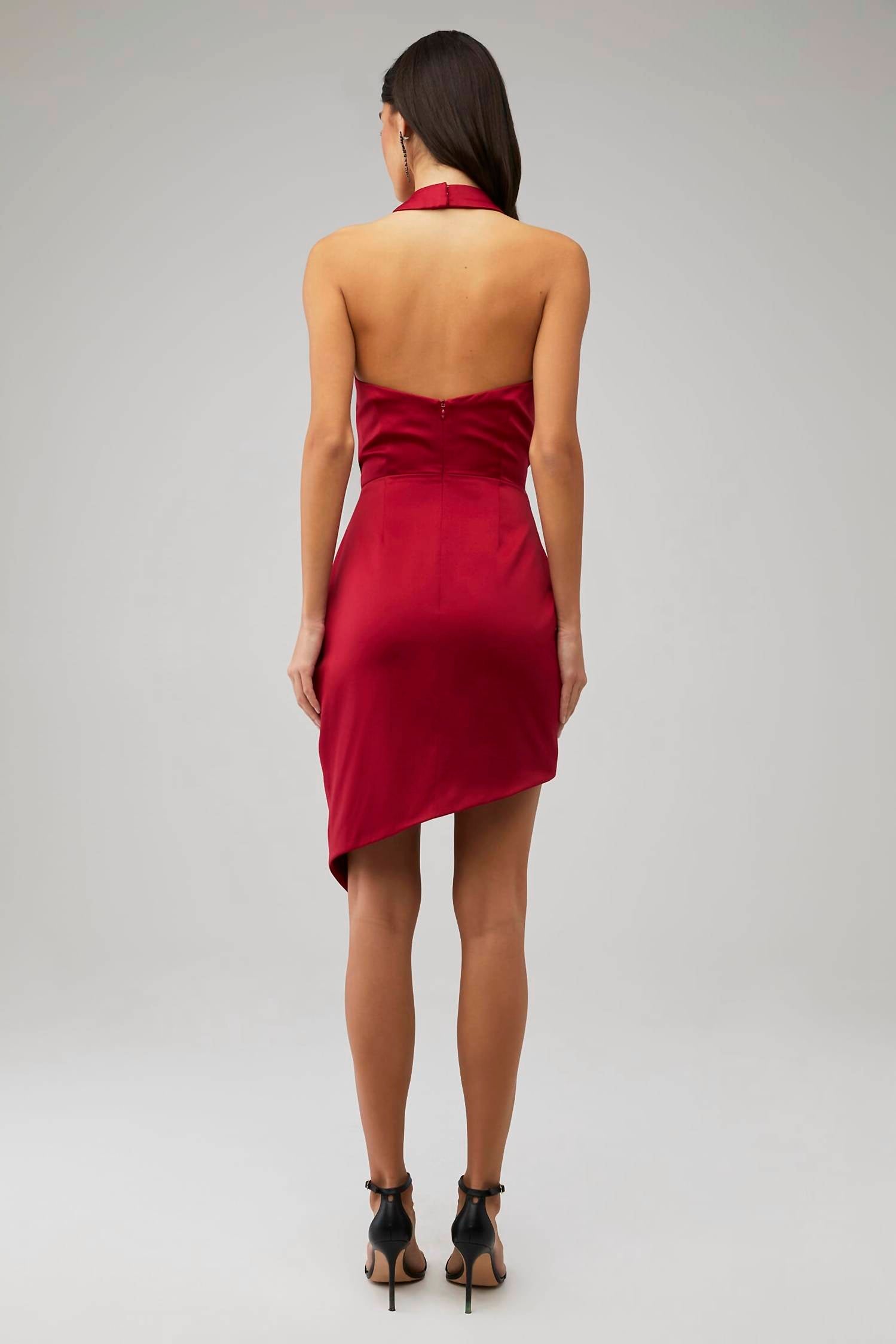 The kind of easy and flattering dress you'll be reaching for all season long. Experience elegance with the ELLIATT Camo Asymmetric Halter Satin Dress in Merlot, a stunning mini dress that reflects minimalist sophistication. Designed with a sleeveless, cutaway shoulder style, it features a luxurious composition of 97% polyester and 3% spandex for comfort and allure. The dress boasts a hidden back-zip closure, ensuring a seamless fit. Care is simple with hand wash instructions, making it a chic and practical addition to any wardrobe. Modeled in an extra small with a height of 5'10", it runs true to size.