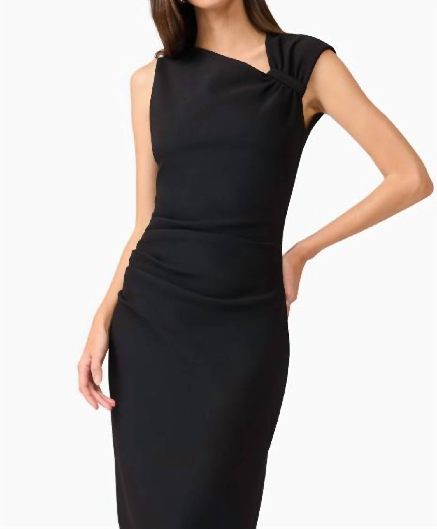 Just add slides or mules and you are good to go. The Jada Midi Dress by ELLIATT is a masterclass in sophistication with its sleeveless design and chic black hue. Made from premium fabrics, it features an asymmetrical V-neckline with subtle shoulder draping that adds a modern twist. This imported, fully lined sheathe silhouette dress is closed with an invisible back zipper for a sleek appearance. Care instructions specify dry cleaning for maintaining its elegance, making it perfect for evening events and fall gatherings, aligning with the quiet luxury trend.