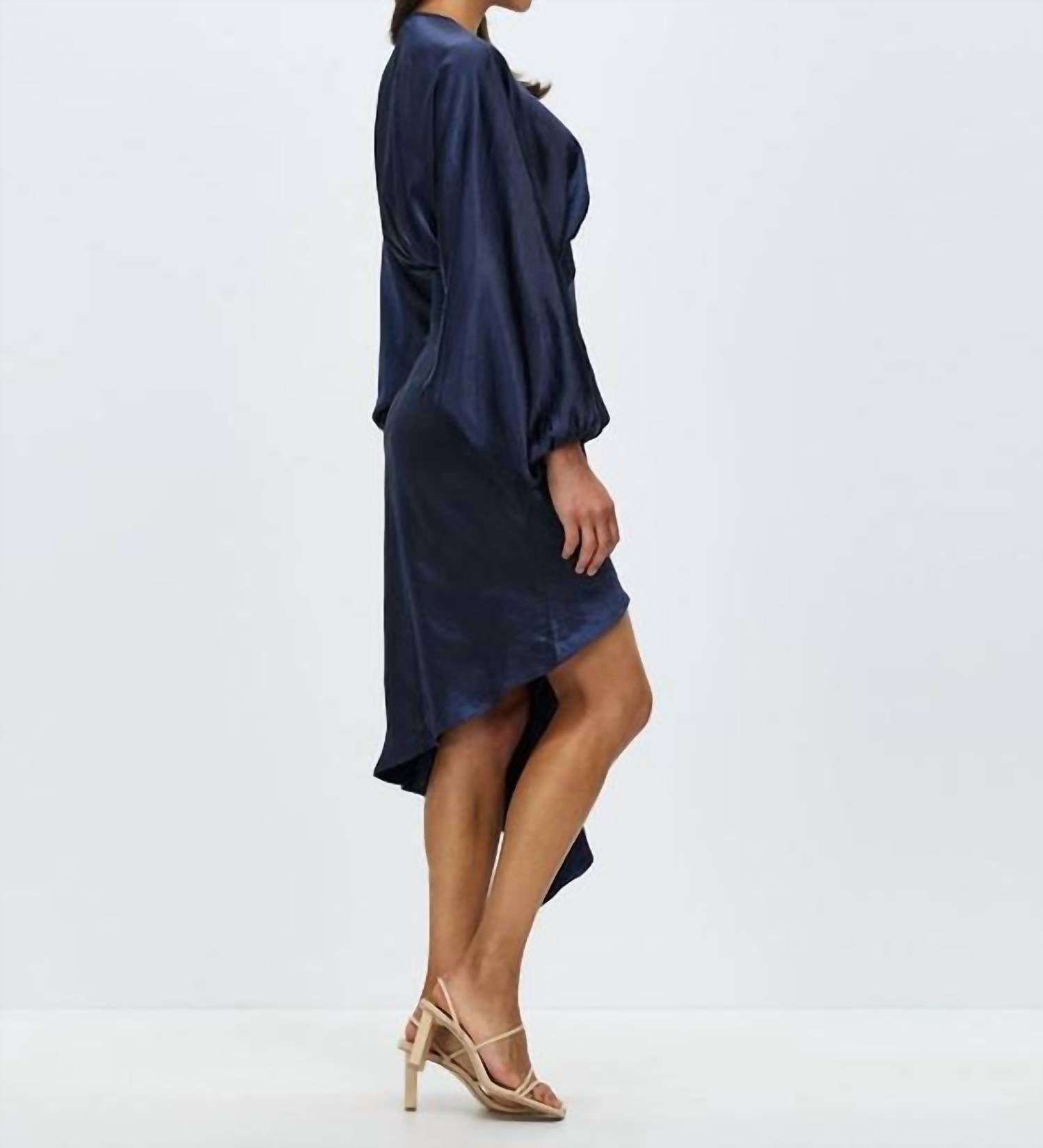 Just add slides or mules and you are good to go. The Jenna Midi Dress by ELLIATT is an elegant choice for your next holiday party. Featuring long blouson sleeves and a soft v-neckline, this navy sheath silhouette is crafted in soft satin with a non-stretch, lined design. The dress boasts a half front button opening and a shirred waist, with a frilled asymmetric skirt adding a playful touch. Closure: Button closure. Care: Dry clean only, making it an ideal statement piece for summer soirées.