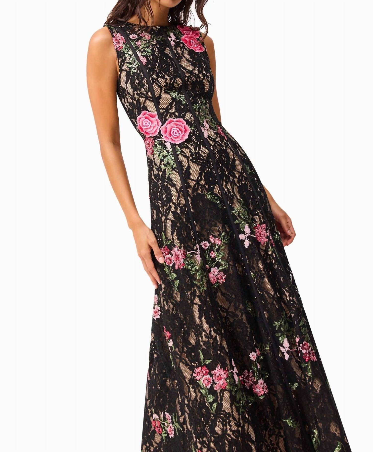 Cute and comfortable, this long sleeve dress has it all. Indulge in sophistication with the Morgaine Maxi Gown by ELLIATT, a glamorous choice for black-tie events. This sleeveless gown is crafted from intricate Chantilly lace with delicate sequin detail, featuring a high neckline that enhances its elegant sheath silhouette. The gown's composition is 48% Nylon, 45% Rayon, and 7% Spandex, fully lined for comfort with a 90% Polyester and 10% Spandex lining. Closure: Centre back zip closure. Care: Dry clean only. Designed for those special occasions, its timeless black with pink and green floral accents makes a striking statement.
