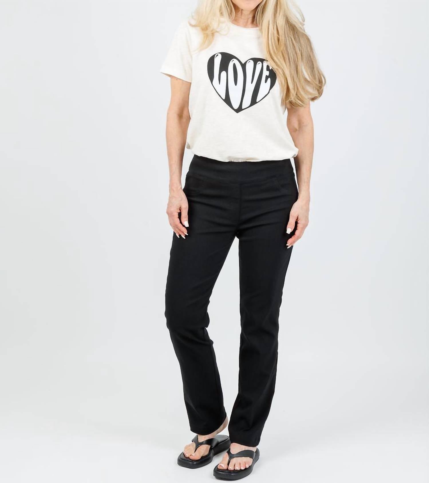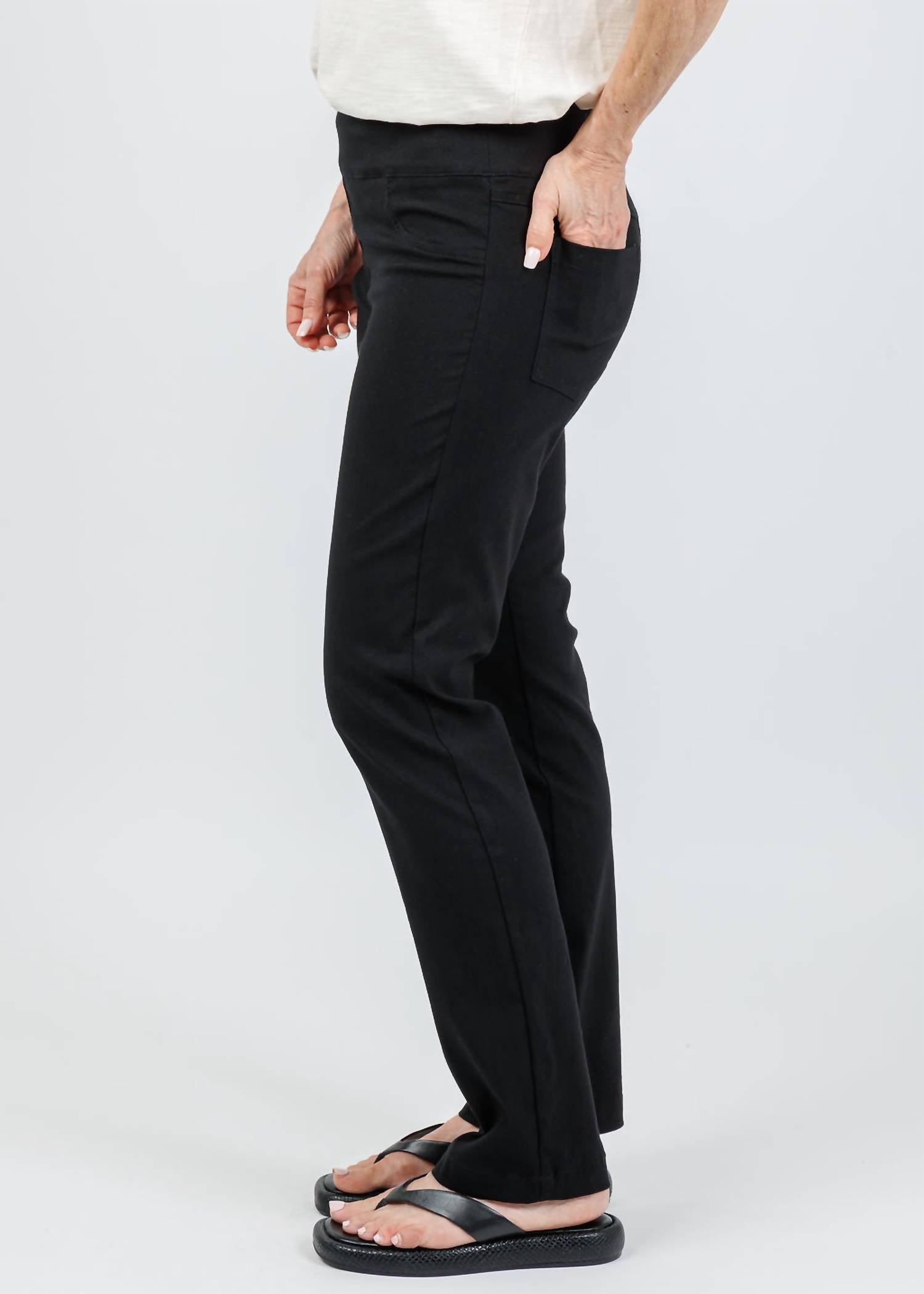 These must-have jeans are fit to perfection. Discover the Elliott Lauren Control Stretch Faux Jeans in classic black, a must-have for the modern woman's wardrobe. With an elastic waistband and straight leg cut, these jeans offer a figure-flattering silhouette, combining the comfort of leggings with the polish of tailored denim. Expertly crafted from a 76% Viscose, 21% Polyamide, and 3% Elastane blend, they feature functional back pockets and a faux denim look. Closure: Pull-on style. Model is wearing a size 4 (Karen: 5'6" height, 34" bust, 25" waist, 34" hip, 28" inseam).