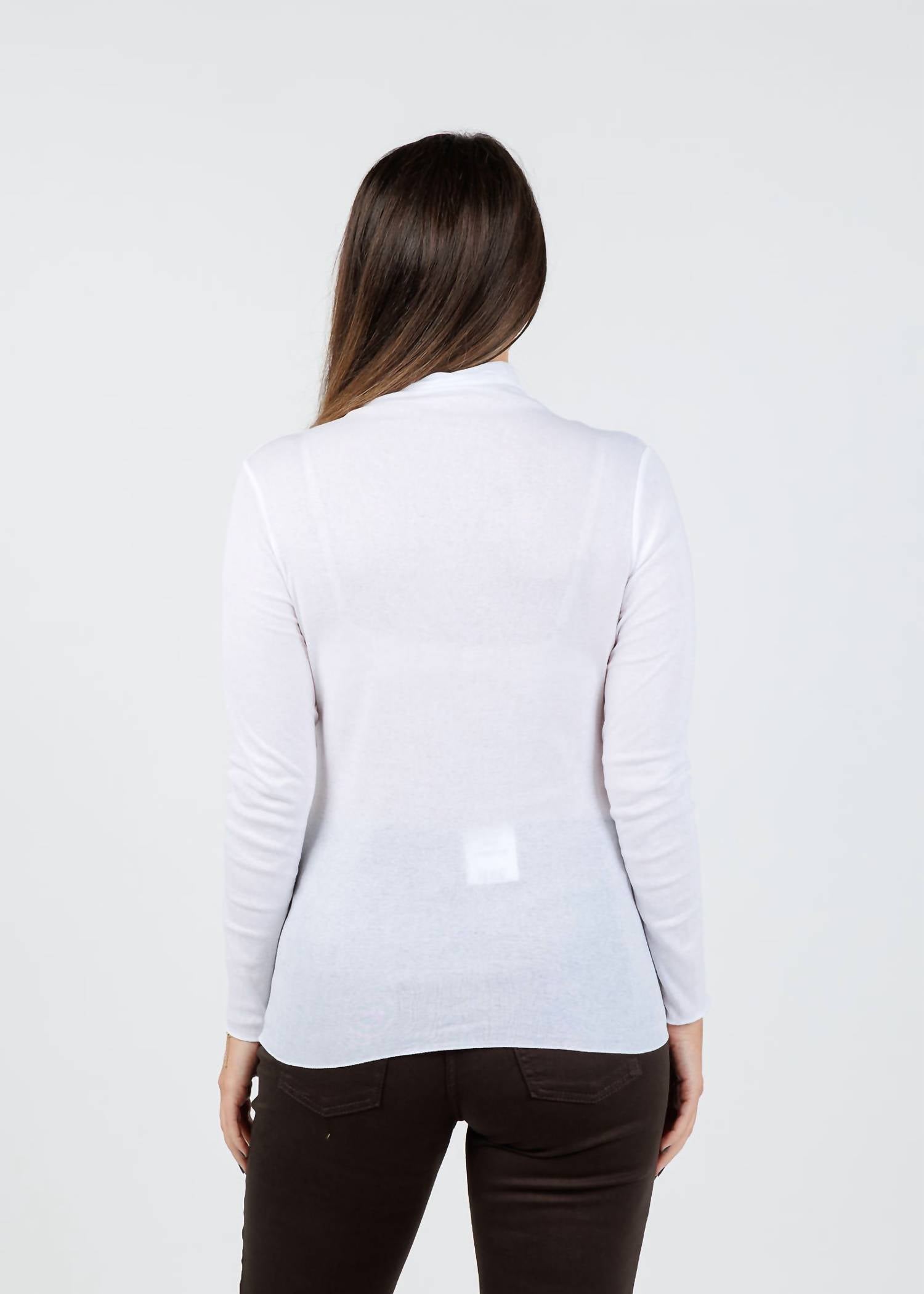 Layer under your favorite sweater or wear tucked into jeans for a perfectly polished winter look. Introducing the White Thin Skinned Turtleneck by Elliott Lauren, a refined essential for the modern wardrobe. This sleek, long-sleeve piece is crafted entirely from 100% cotton, offering breathability and comfort. Designed with a classic turtleneck and a flattering slim fit, it boasts a soft, lightweight feel ideal for layering. Closure: Pull on. Model is wearing a size small (5'6" height, 34" bust, 28.5" waist, 31" hip, 29" inseam).
