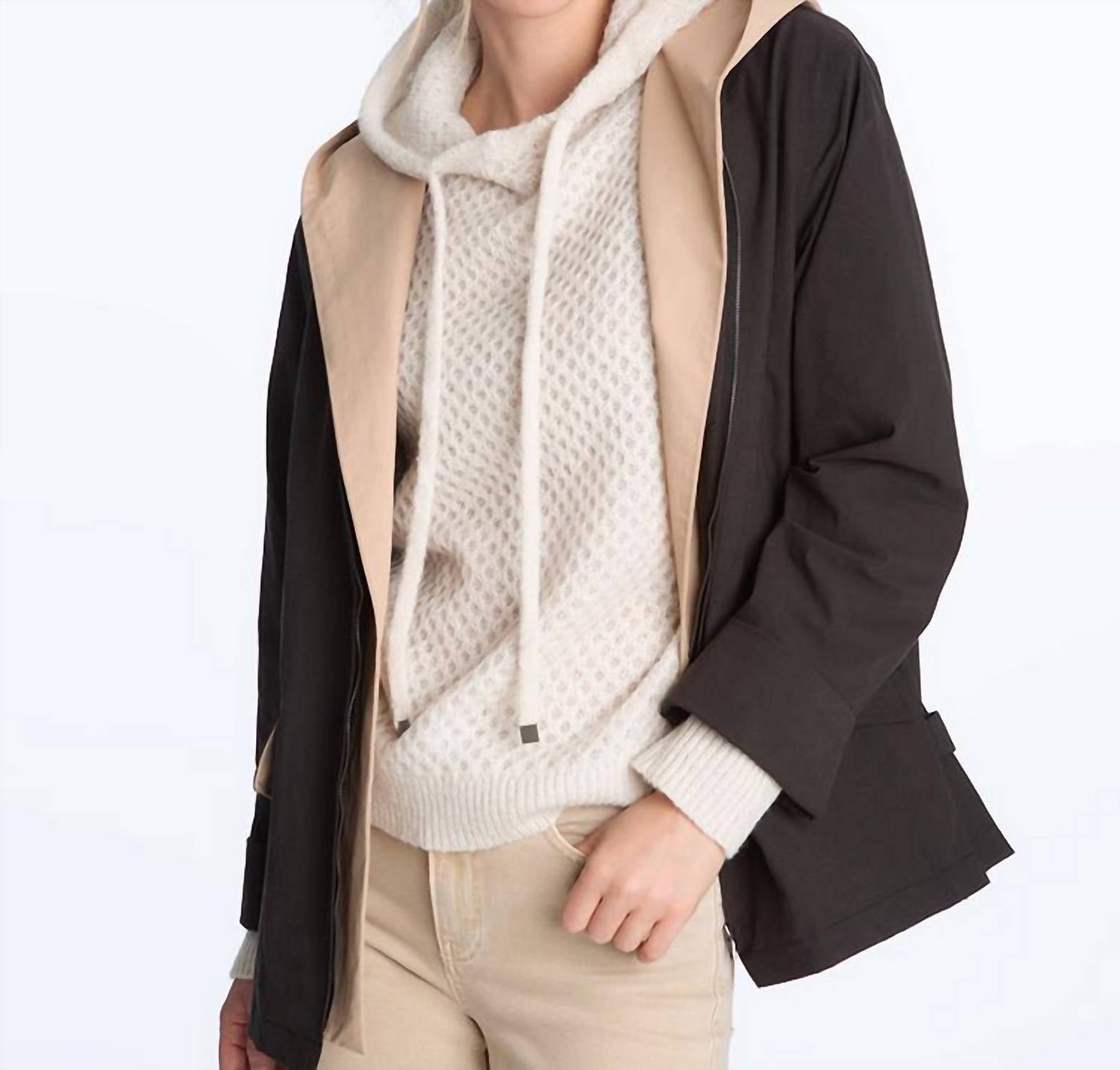 A casual yet cool jacket that every closset needs. Elevate your outerwear collection with the Two Tone Hooded Jacket by Elliott Lauren, a chic layering piece in striking black and tan. This minimalistic casual jacket features long sleeves, a soft mesh lining for added comfort, and practical front pockets. Crafted with 50% cotton and 50% nylon for the body and 100% polyester lining, it boasts a front zip closure and a contrast tan hood for a unique touch. Care for it delicately with Eucalan detergent and lay it flat to dry.
