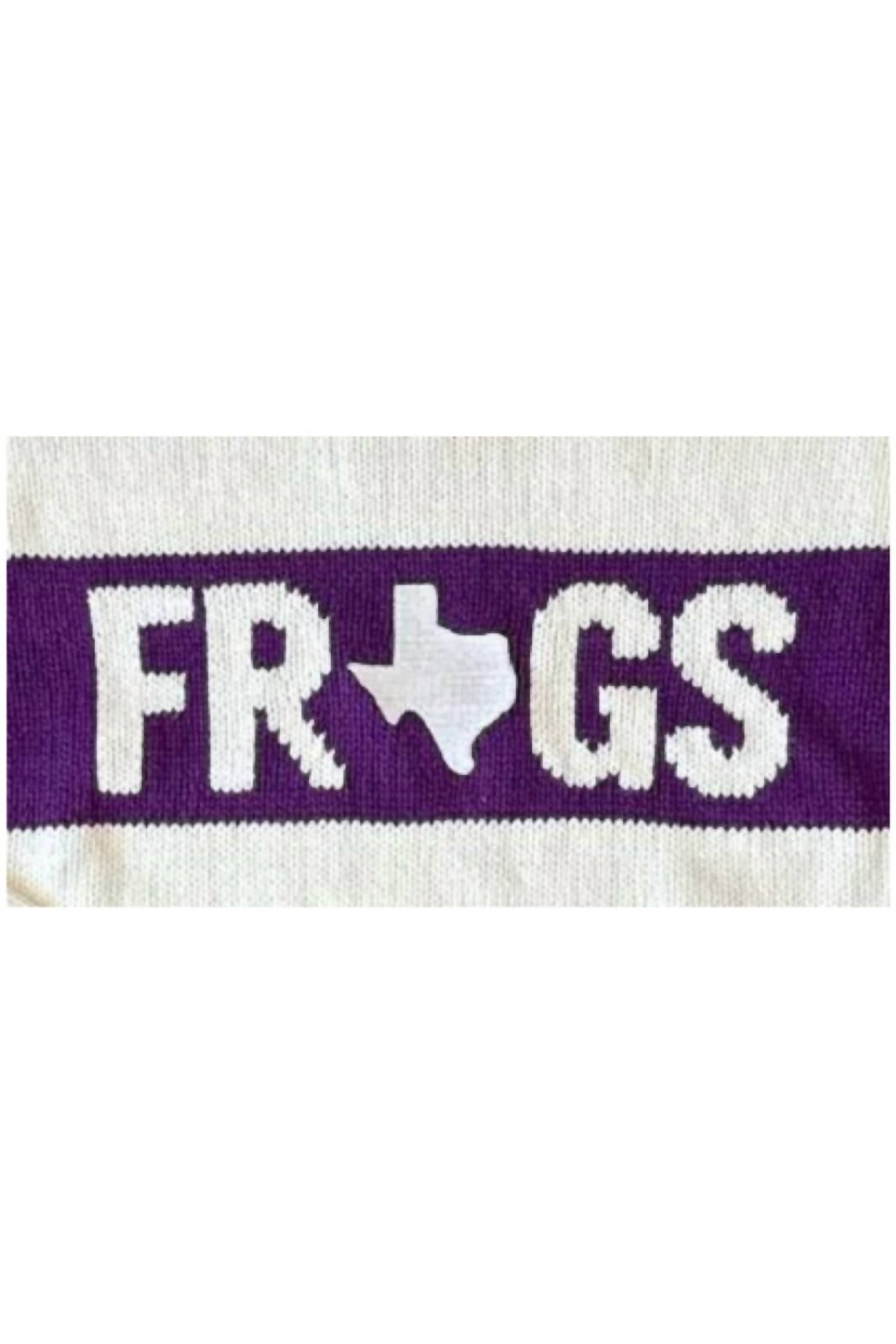 Stay warm and stylish in this versatile and effortlessly cool knitwear staple. Wear it alone or layered, it's the perfect sweater for the season and you'll wish you had it in every color. Unveil the Women's Frogs Varsity Stripe Sweater by Ellsworth + Ivey, the perfect blend of flair and loyalty. This ivory and purple varsity-style sweater features long sleeves and a distinguished crewneck with "FROGS" knit across the front. Its pull-on closure and soft, textured material ensure top-notch comfort for any fall occasion. Crafted for minimalist style, care for this piece with machine wash instructions and lay flat to dry for lasting quality.